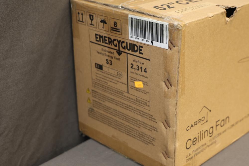 Carro CFP523Q5L 52 Inch Ceiling Fan, featuring a sleek design with durable materials and equipped with a built-in LED light and remote control. The box includes the fan blades, installation instructions, and all necessary components for setup. Pickup only.