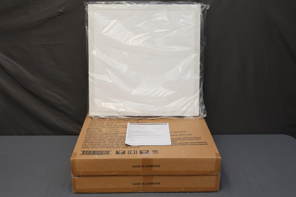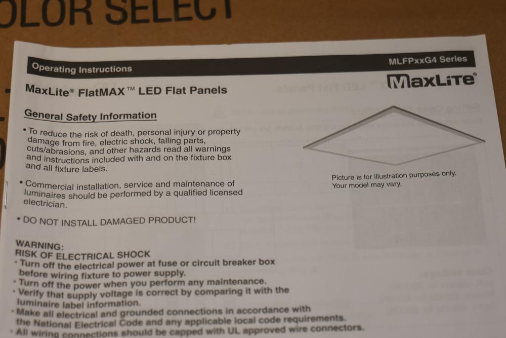 MaxLite 105188 FlatMax LED Flat Panel 2 ft by 2 ft, Gen 4 Wattage, Color Select, Control Ready. Includes three units with adjustable wattage settings of 18W, 27W, and 36W and selectable color temperatures of 3500K, 4000K, and 5000K. Operates on 120-277 Vac at 50/60 Hz. Suitable for damp locations and installation above ceiling tiles. Pickup only.
