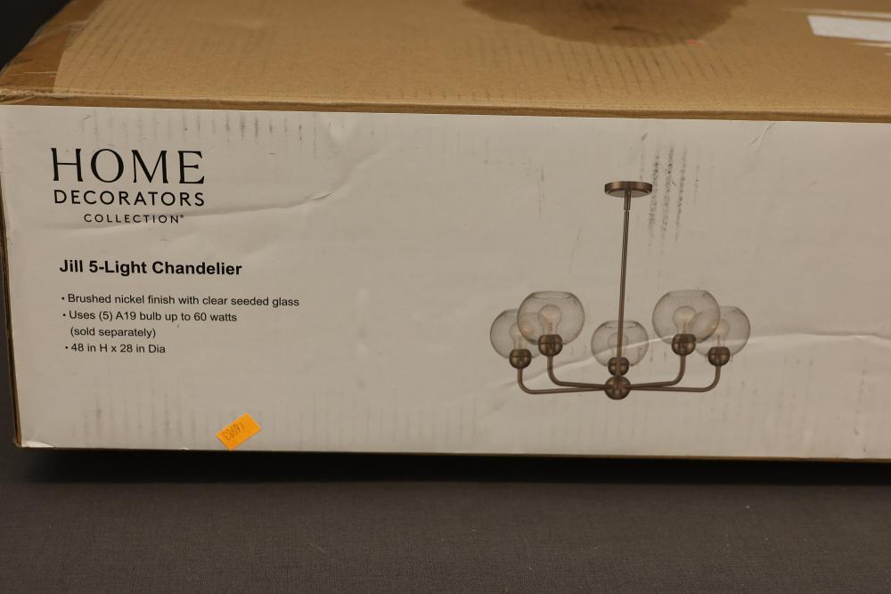 Home Decorators Collection Jill 5-Light Chandelier in Brushed Nickel Finish with Clear Seeded Glass. Features brushed nickel finish and clear seeded glass design. Uses five E26 A19 light bulbs up to 60W each (not included). Dimensions measure 48 inches in width and up to 120 inches in height. Comes in original packaging. Pickup only.