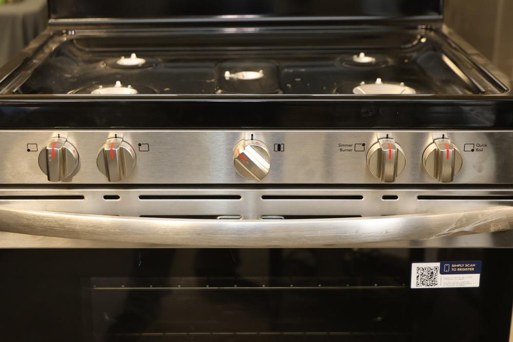 Frigidaire FCRG3062AS 30 Inch 5 Burner Freestanding Gas Range in Stainless Steel with Quick Boil and Steam Clean. Features five burners, Quick Boil setting, and a Steam Clean function. Condition may vary, please see photos for details. Pickup only.