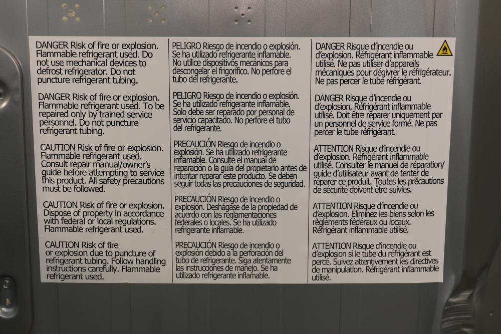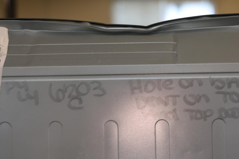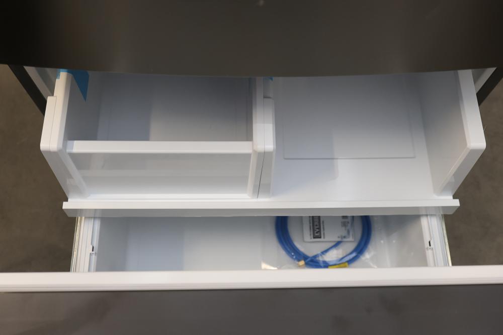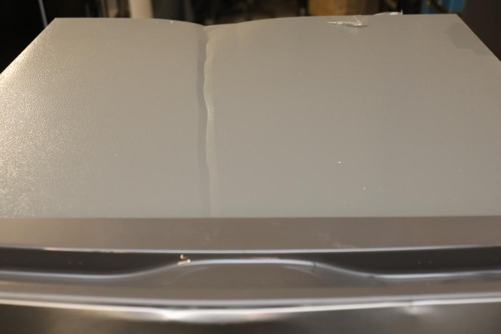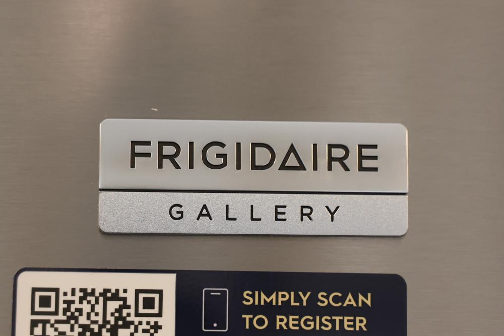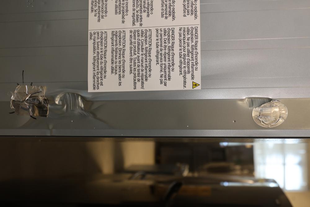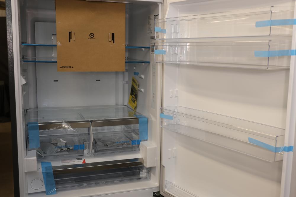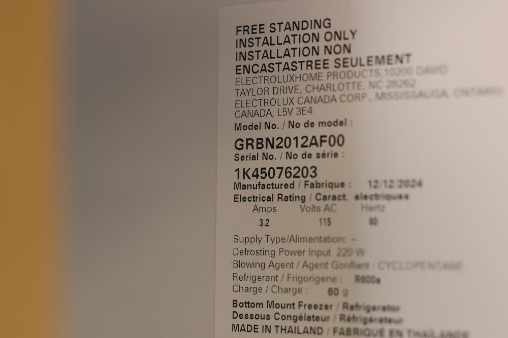 Frigidaire Gallery GRBN2012AF Standard-Depth Bottom Freezer Refrigerator with 20 cubic feet of depth. The unit has two holes on the back, and additional cosmetic imperfections are visible, including dents and scratches. Includes bottom freezer design for efficient storage. Condition may vary, please review photos for details. Pickup only.