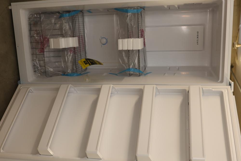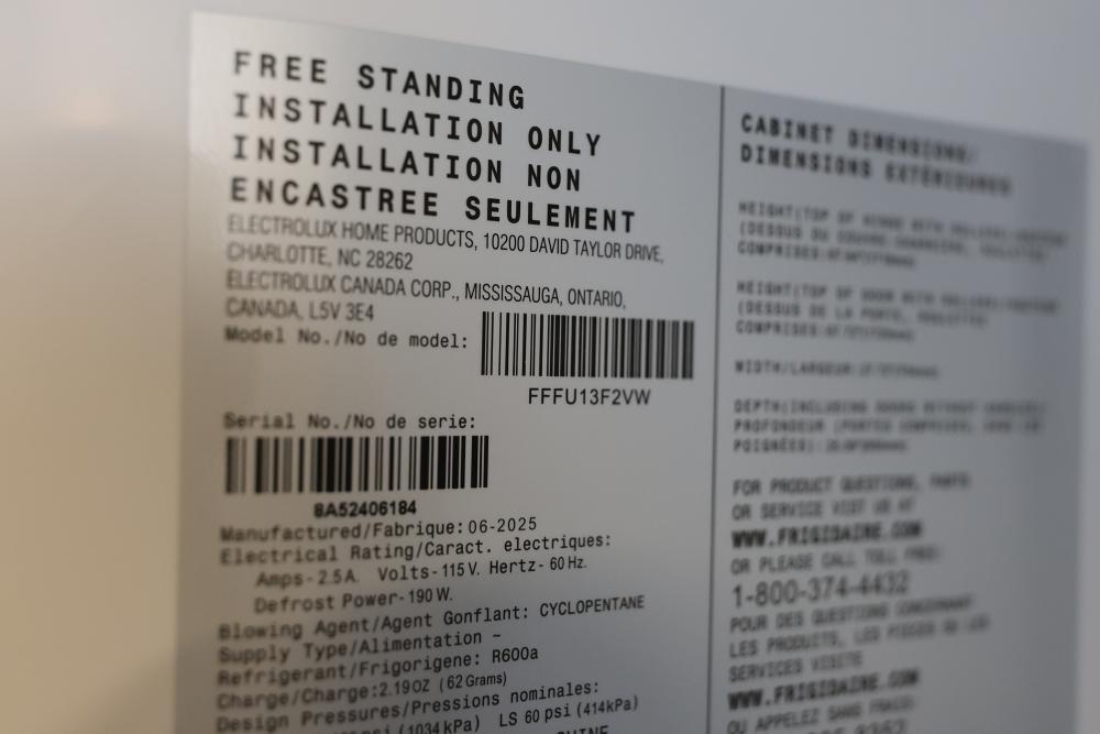 Frigidaire FFFU13F2VW 28 Inch Freestanding Upright Garage Freezer with 13 cubic feet capacity. The freezer features a robust design suitable for garage placement, providing ample storage space. Condition may vary, see photos for details. Pickup only.