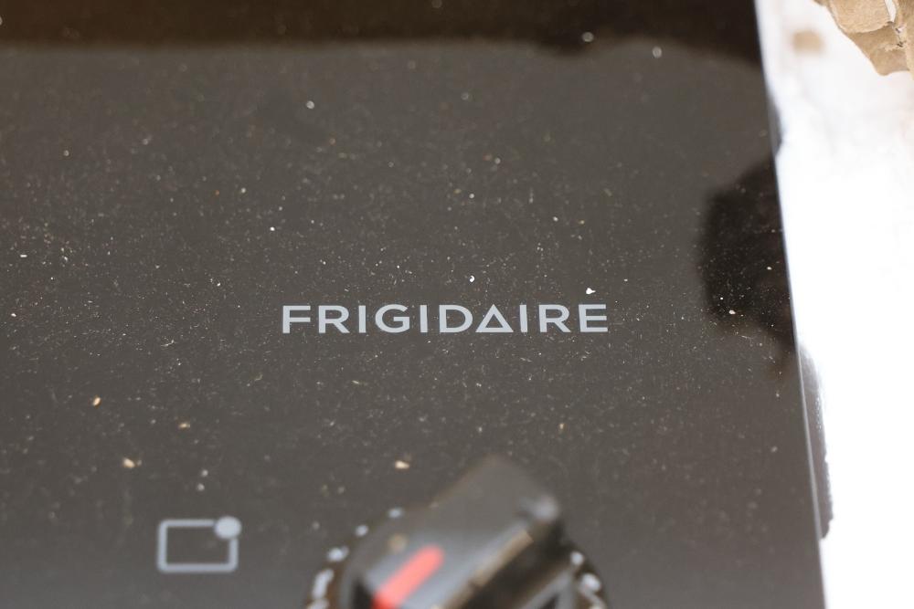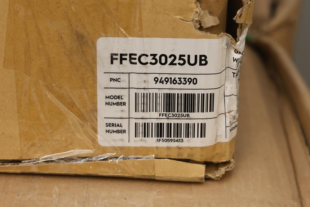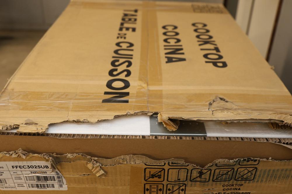 Frigidaire FFEC3025UB 30 Inch Electric Cooktop - Visible Damage Near Knobs. Box shows wear and damage. Cooktop includes visible damage near the knob area, please refer to photos for further details and condition. Pickup only.