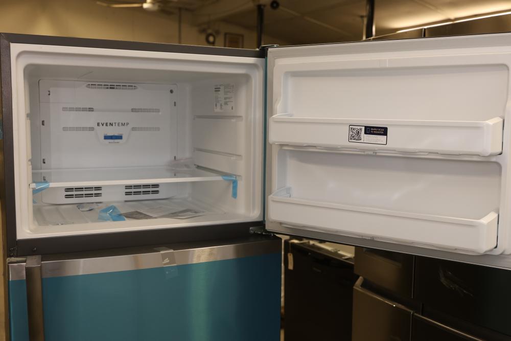 Frigidaire FFHT2022AS 30 Inch Garage Ready Freestanding Top Freezer Refrigerator in Stainless Steel. Features a spacious top freezer and bottom refrigerator compartment with adjustable shelves. Stainless steel finish with protective blue film intact. See photos for details and condition. Pickup only.