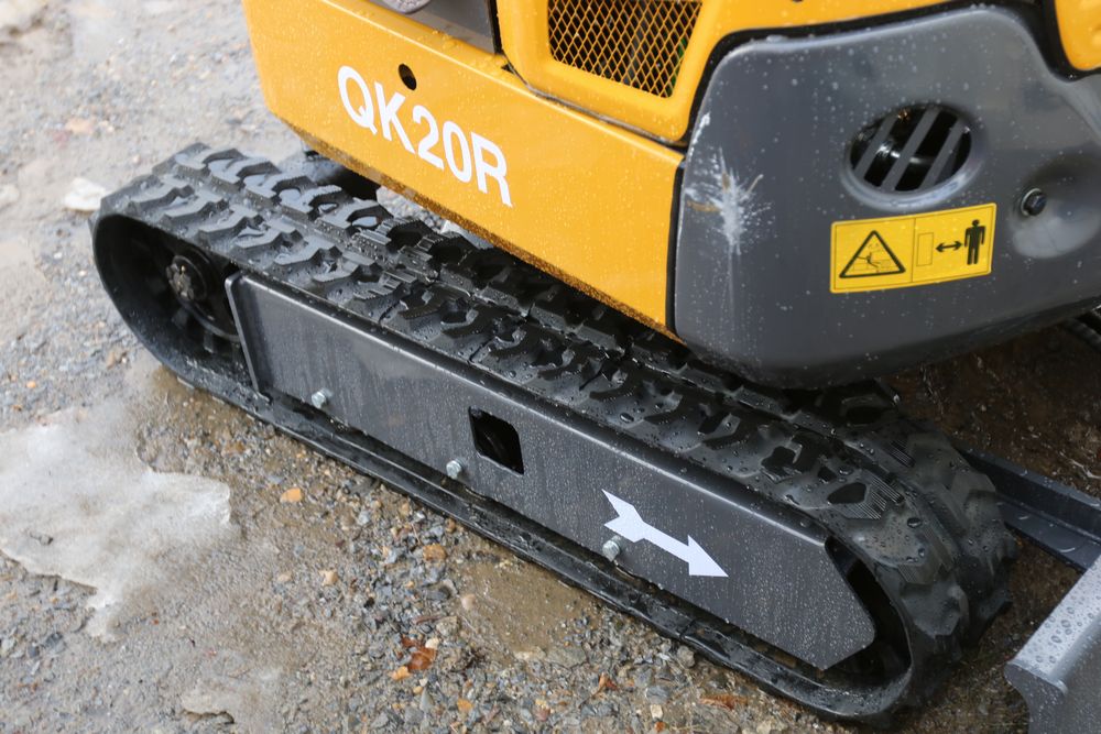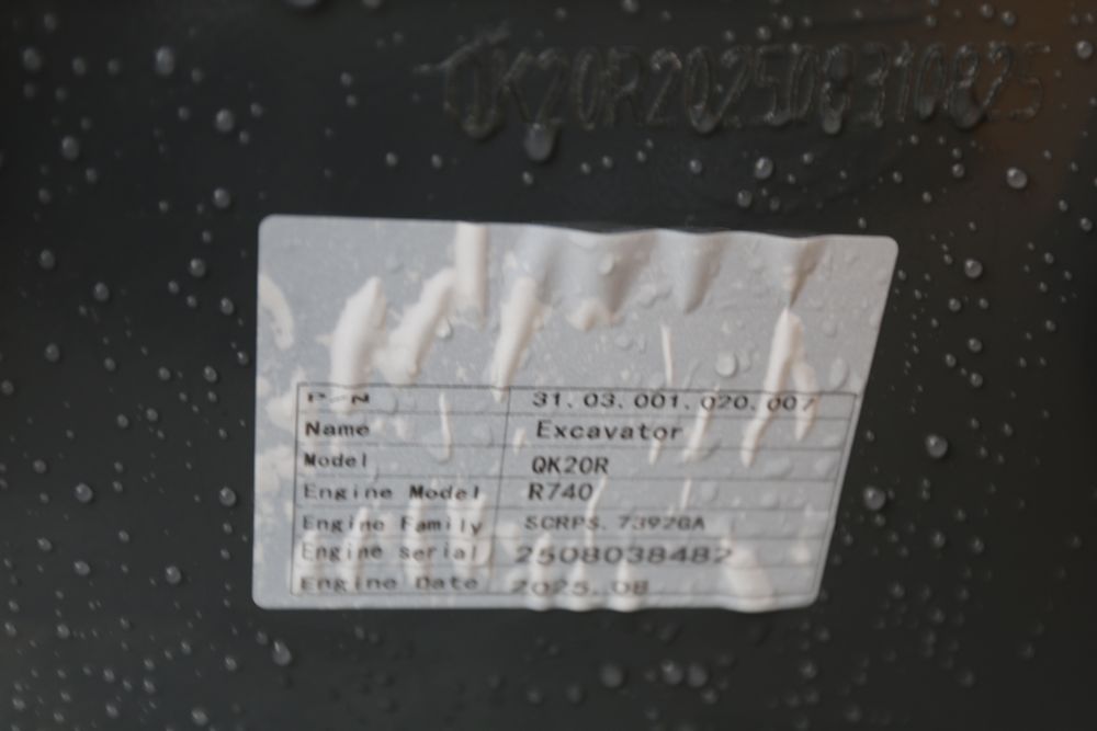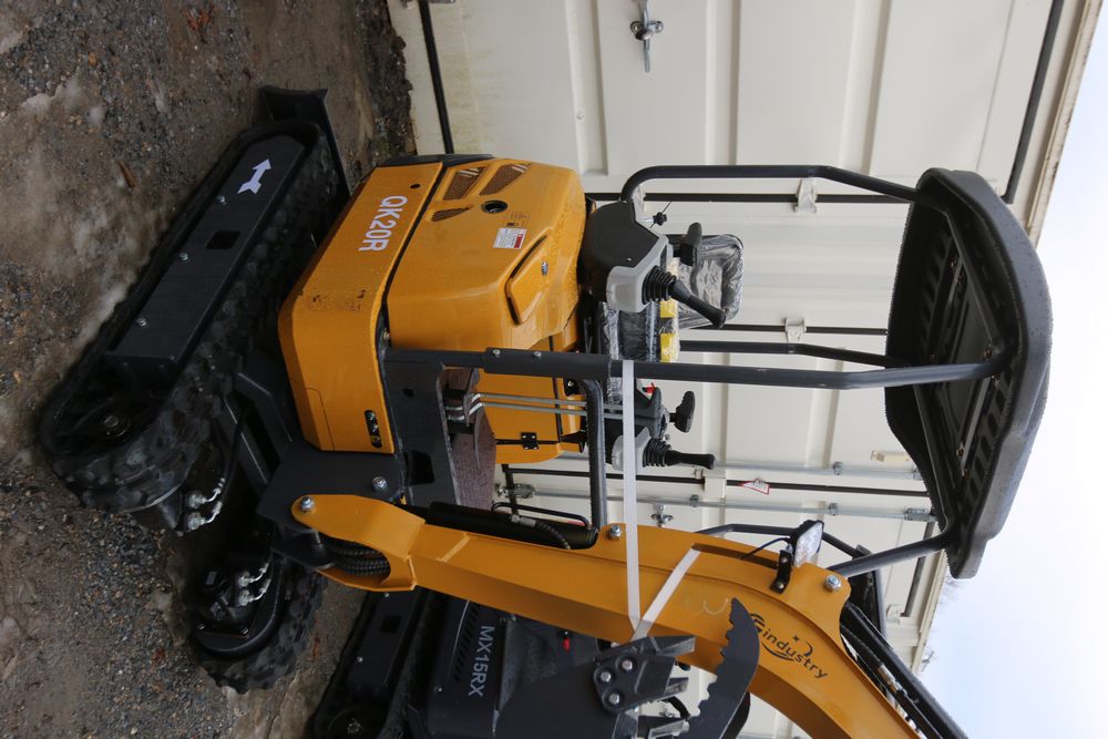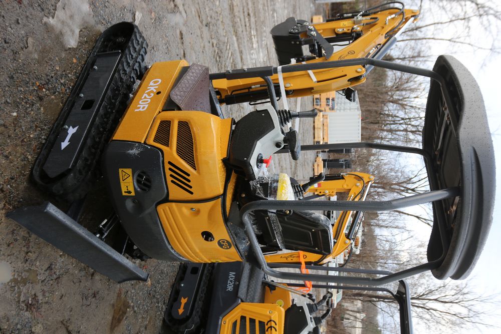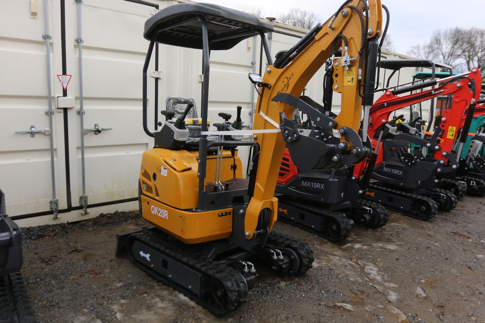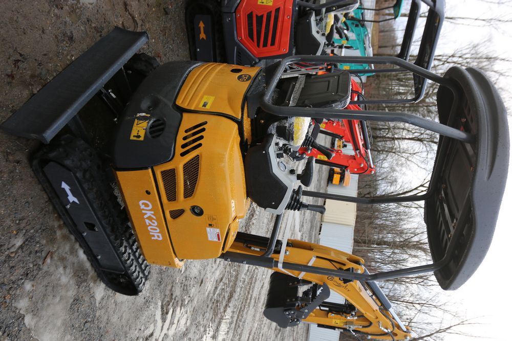 New 2025 CFG Industrial gas powered mini Excavator model QK20R with bucket, dozer blade, hydraulic thumb, aux hydraulics, RATO 23HP, and canopy cover. Hours reading less than 1 hour.
