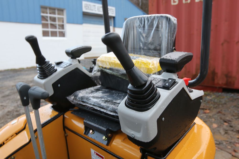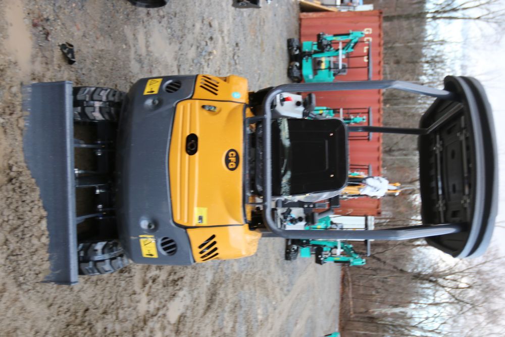 New 2025 CFG mini excavator, model QK18R, RATO, 13.5HP, 8.6KW, with pilot system, hydraulic thumb, rubber tracks, dozer blade, and gasoline engine. Hours reading less than one hour.