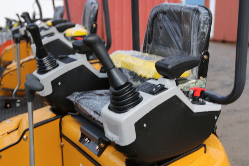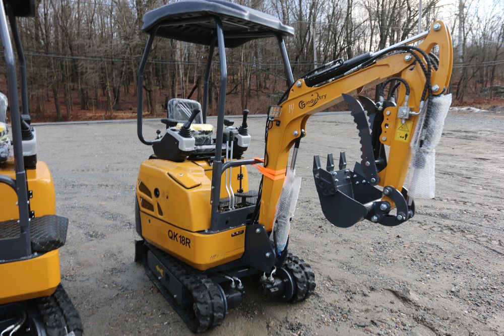 New 2025 CFG mini excavator, model QK18R, RATO, 13.5HP, 8.6KW, with pilot system, hydraulic thumb, rubber tracks, dozer blade, and gasoline engine. Hours reading less than one hour.