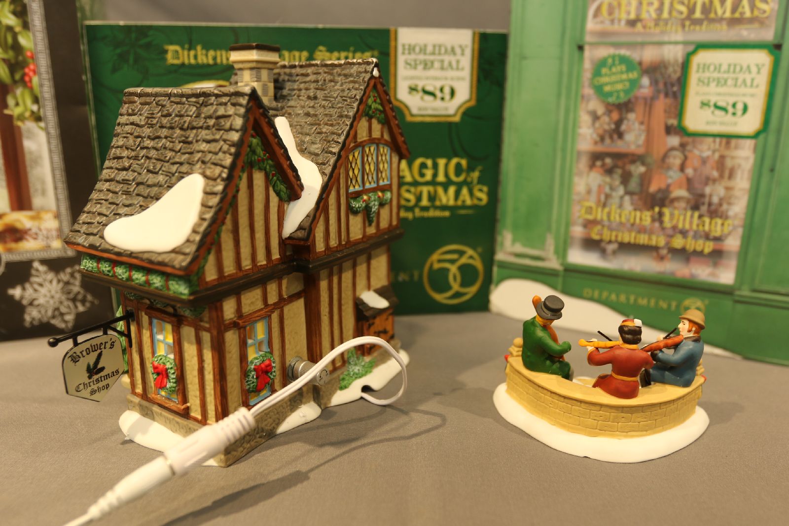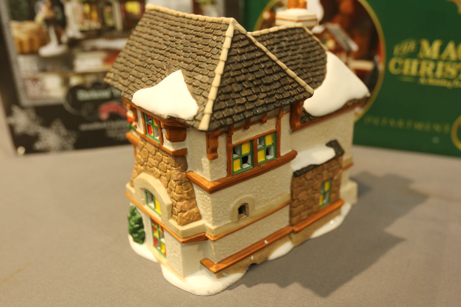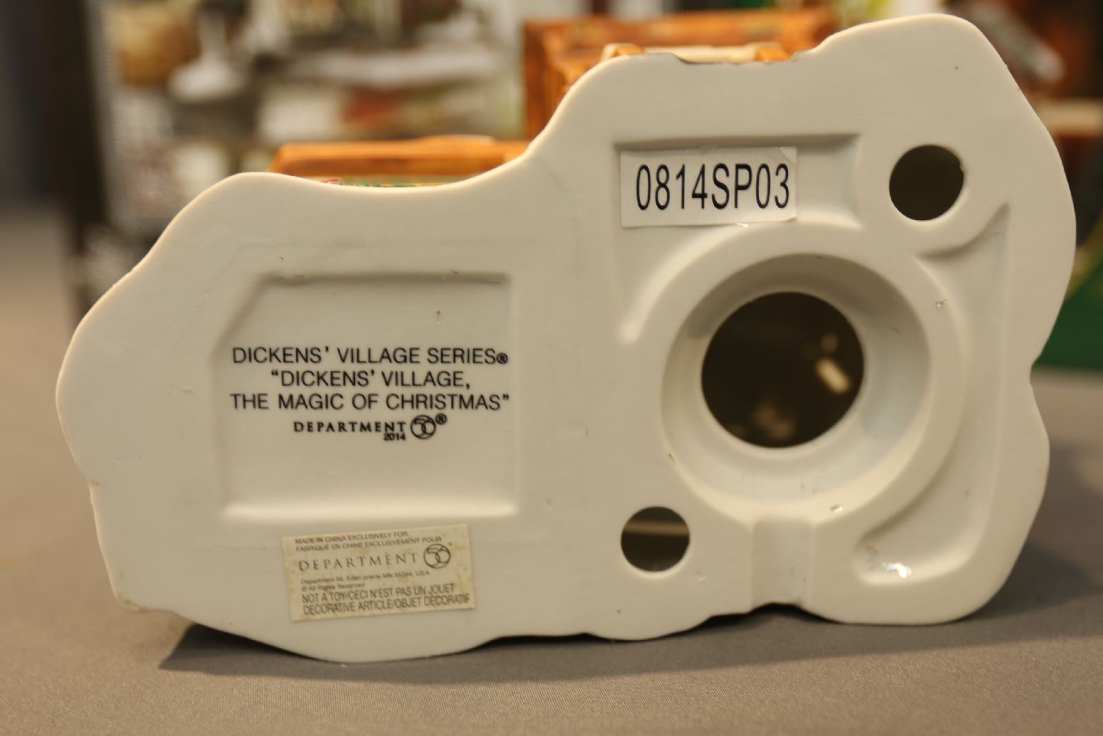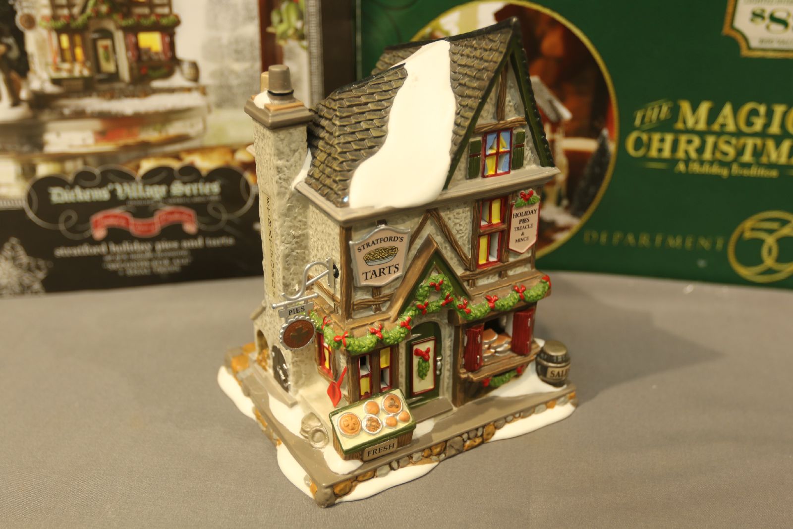 Department 56 Dickens Village Series Buildings and Accessories. Includes "Stratford Holiday Pies and Tarts", "Dickens' Village, The Magic of Christmas", and "Dickens' Village, The Sounds of Christmas" with original boxes. Conditions may vary.