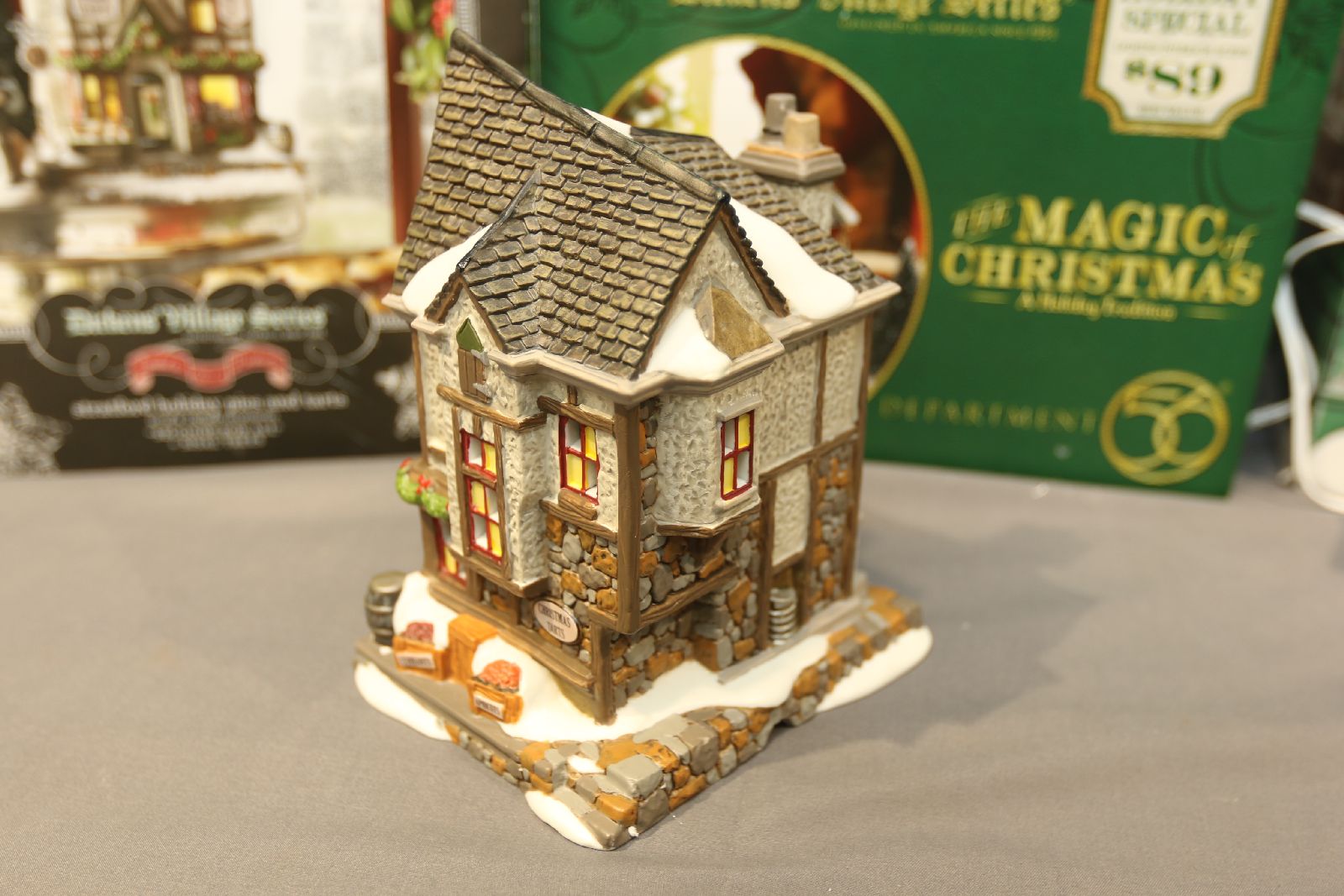 Items are Department 56 Dickens Village Series Buildings & Accessories from one collector. Items include "Stratford Holiday Pies and Tarts"; "Tegan's Toy Shoppe," "Burwickglen Golf Clubhouse," illuminated buildings: Brandon Mill, Devonshire Creamery," "Boar's Bacon & Candied Hams"; Porcelain Buildings & Accessories. Includes "A Christmas Carol" series: "M Fezziwig Warehouse," "Scrooge & Marley," Heritage Village Figurines & Accessories. Includes various figurines like "Not too Fast, Please," "Town Blacksmith," "To the Manor Born"; Village Series and Village Accessories Figurines. Includes "Buyer one for Prosperity," "Backyard Bird Houses,"; holiday decorations: snowmen figurines, holiday-themed trees, Christmas lights & more. Items are located in Pleasant Valley, NY.