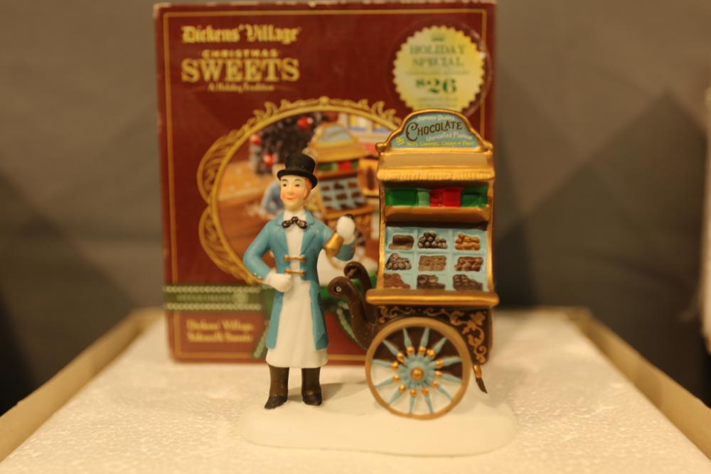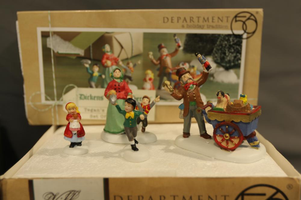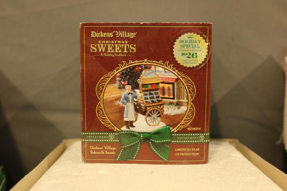 Department 56 Dickens Village Buildings and Accessories with Boxes. Includes "Dickens' Village, Welcoming Christmas," "Tegan's Toy Shoppe," "Tegan's Accessory Set," "The Magic of Christmas, Santa's Magic Sleight," "Sidewalk Sweets," in original boxes. Conditions may vary.