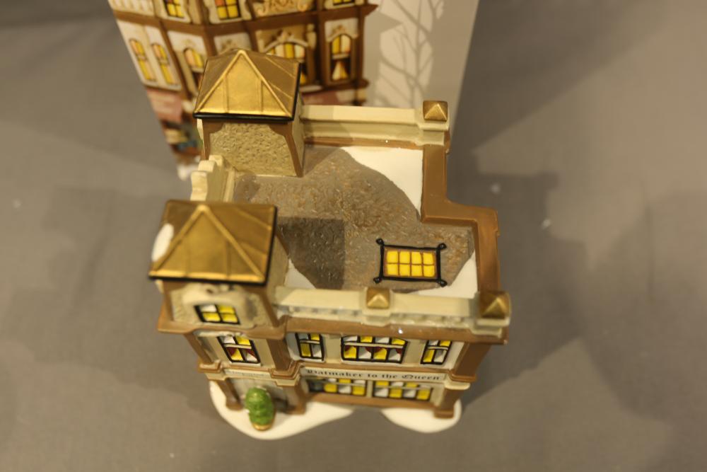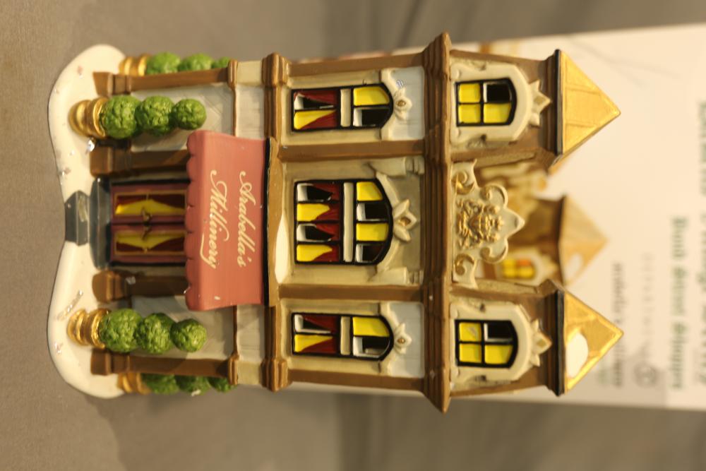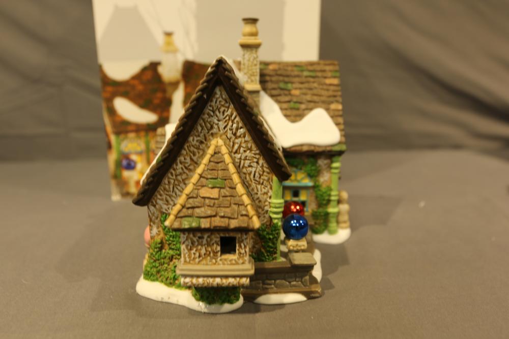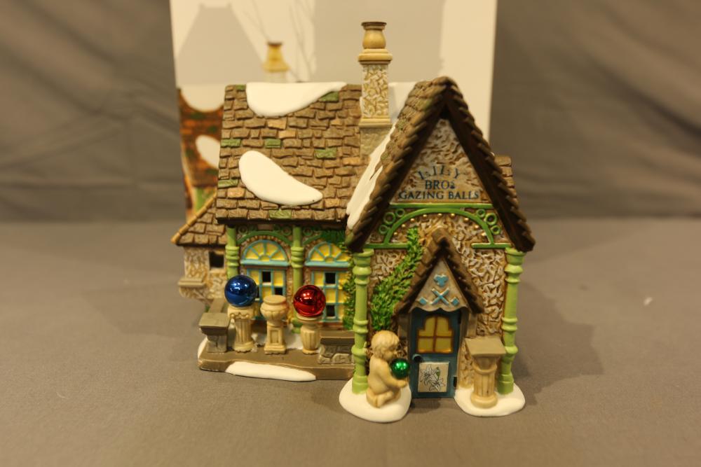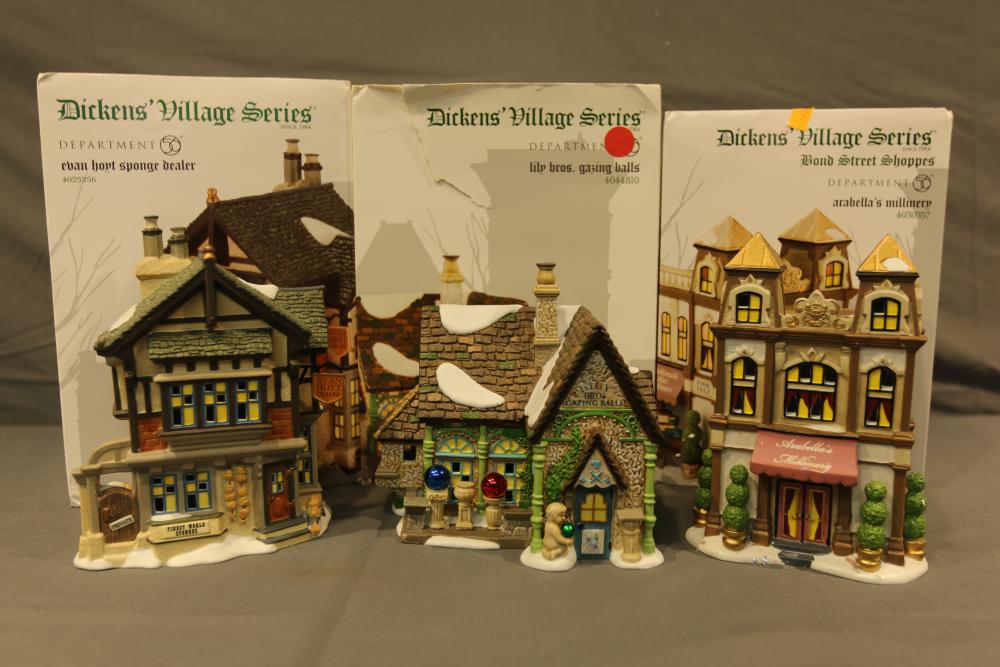 Department 56 Dickens' Village Series Lighted Buildings. Includes "Evan Hoxley, Spice Dealer," "Lily Bros. Gazing Balls," and "Bond Street Shoppes." with original box.