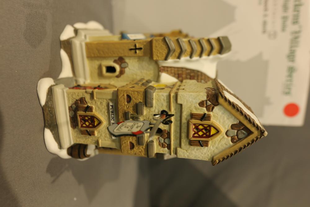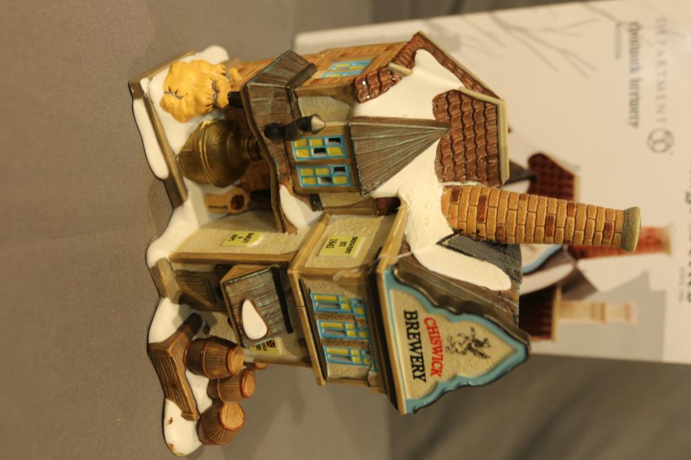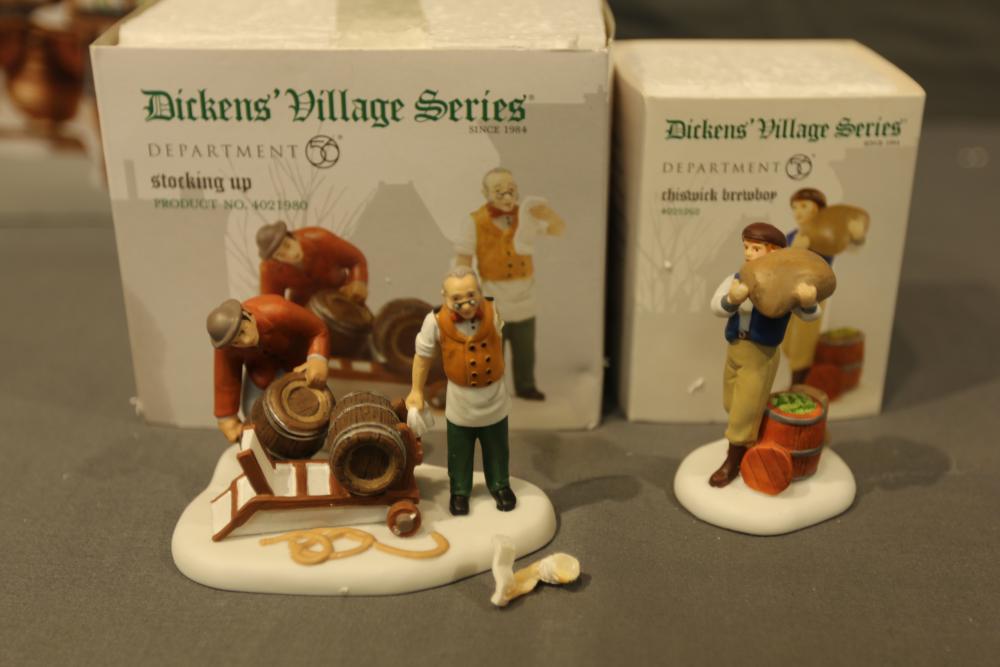 Department 56 Dickens Village Series Buildings and Accessories. Includes "The Sword and Shield" and "Chestnut Brewery" buildings, "Stocking up" and "Chiswick Brewboy" figures with original boxes. Chiswick Brewery figure has damage to roof.