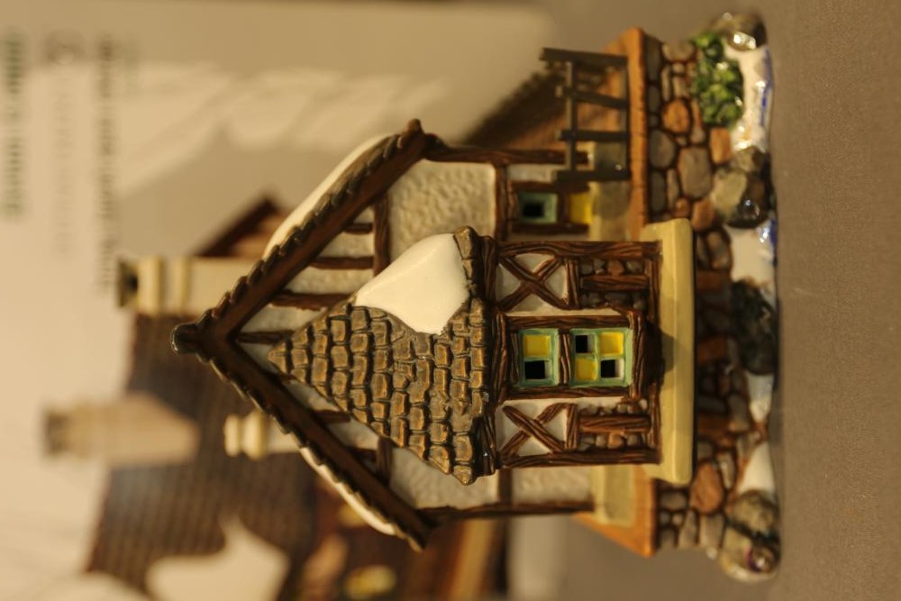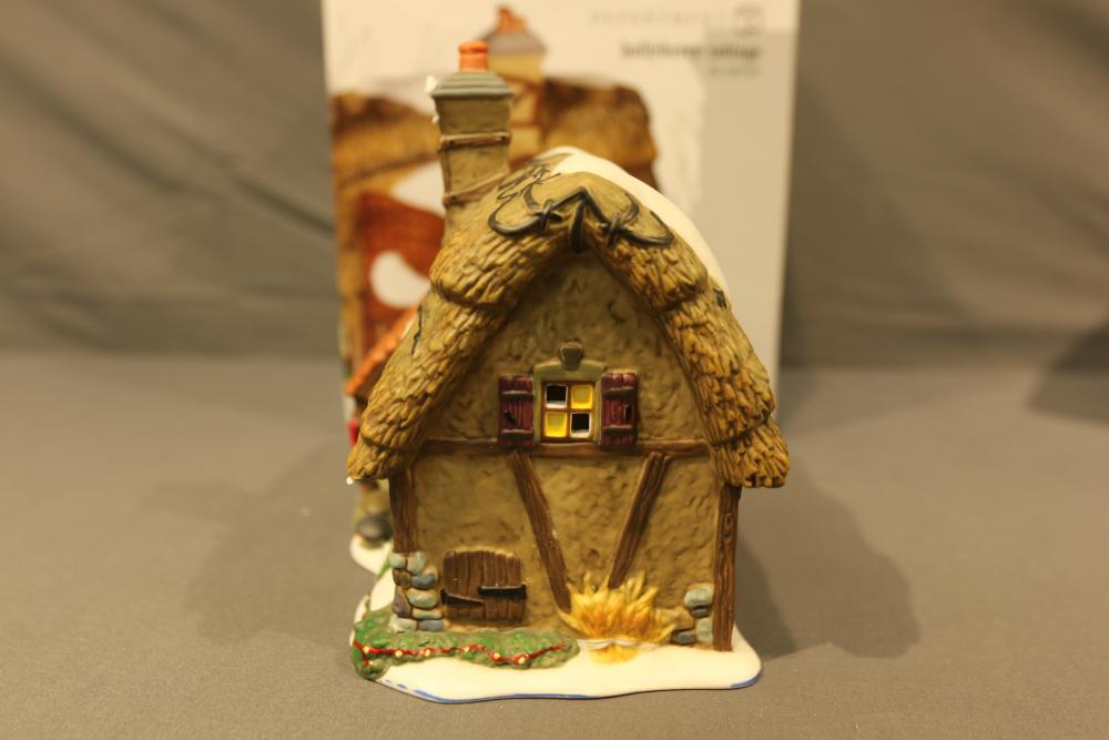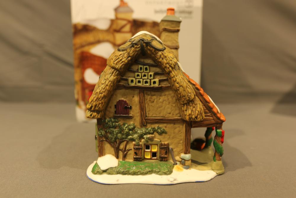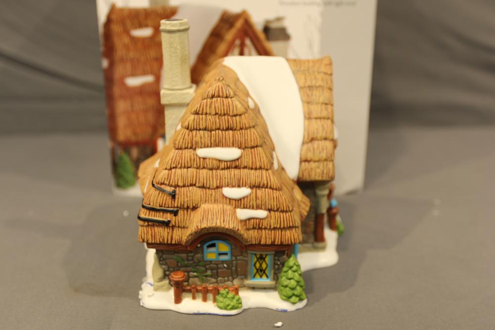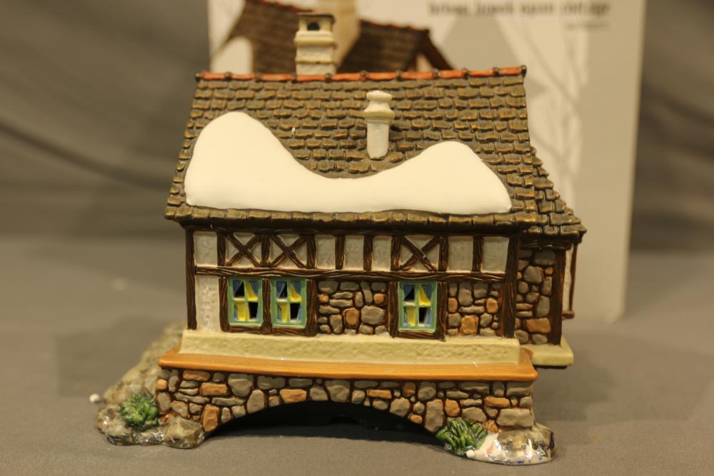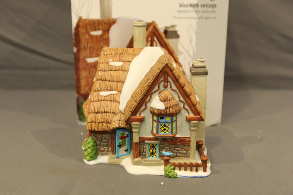 Department 56 Dickens' Village Series Buildings. Includes "Hollyberry Cottage," "Bluebird Cottage," and "Devon Brook Span Cottage." with original boxes. Conditions may vary.