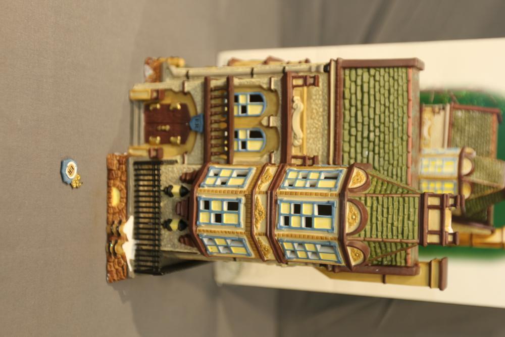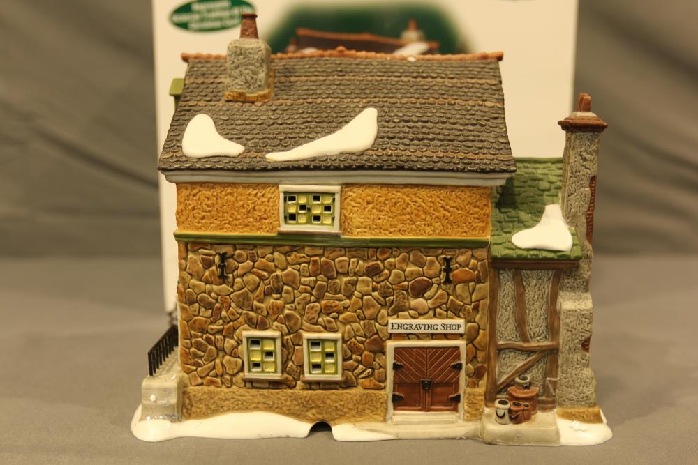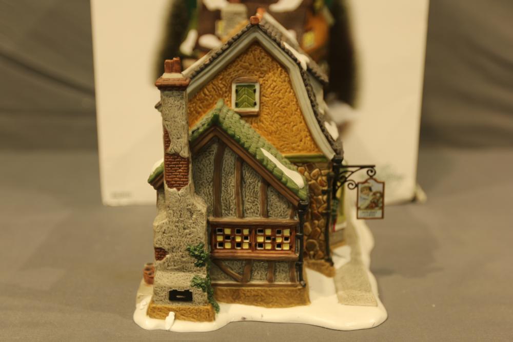Items are Department 56 Dickens Village Series Buildings & Accessories from one collector. Items include "Stratford Holiday Pies and Tarts"; "Tegan's Toy Shoppe," "Burwickglen Golf Clubhouse," illuminated buildings: Brandon Mill, Devonshire Creamery," "Boar's Bacon & Candied Hams"; Porcelain Buildings & Accessories. Includes "A Christmas Carol" series: "M Fezziwig Warehouse," "Scrooge & Marley," Heritage Village Figurines & Accessories. Includes various figurines like "Not too Fast, Please," "Town Blacksmith," "To the Manor Born"; Village Series and Village Accessories Figurines. Includes "Buyer one for Prosperity," "Backyard Bird Houses,"; holiday decorations: snowmen figurines, holiday-themed trees, Christmas lights & more. Items are located in Pleasant Valley, NY.