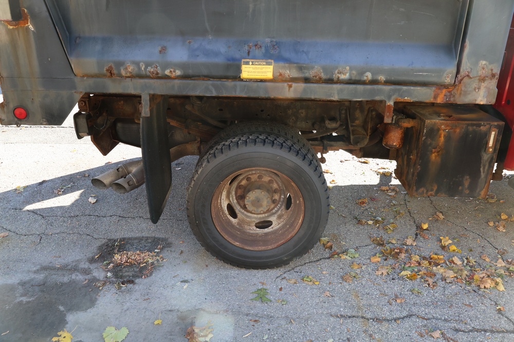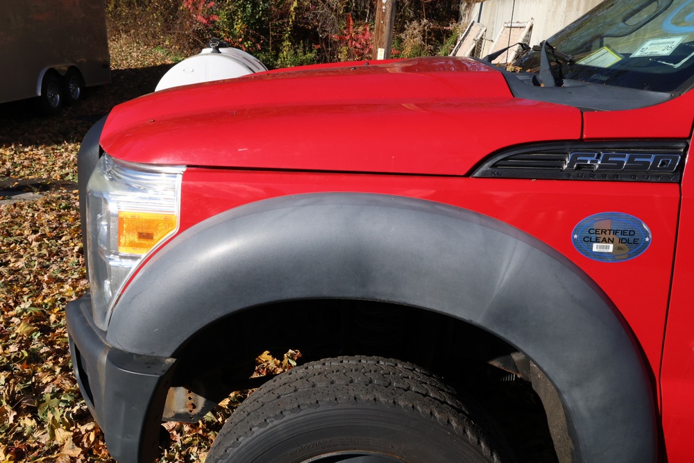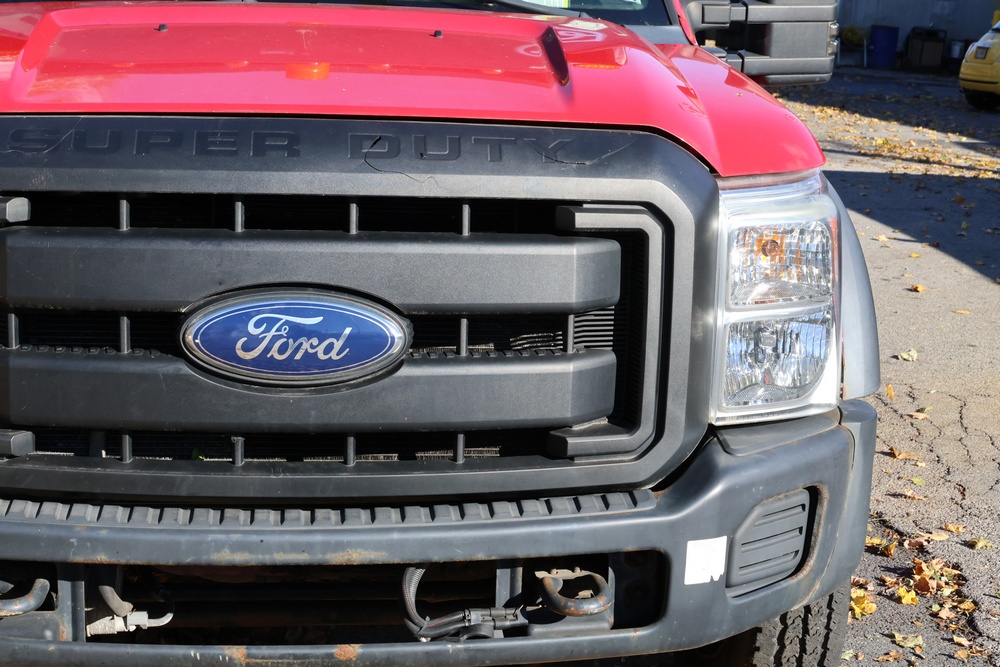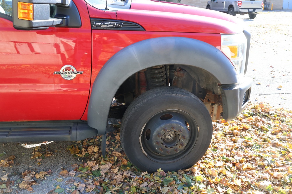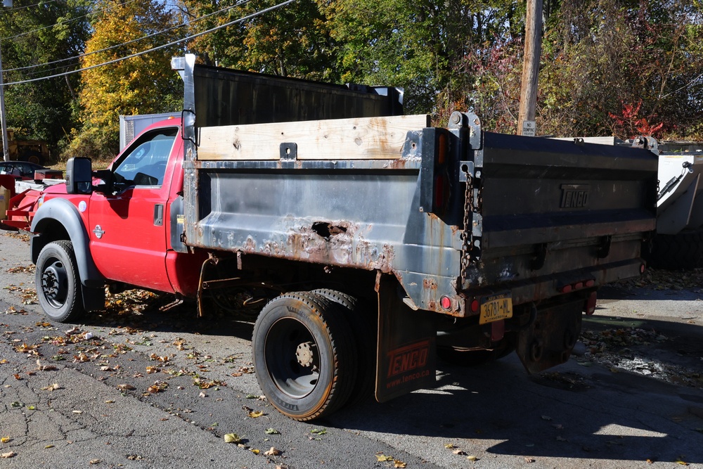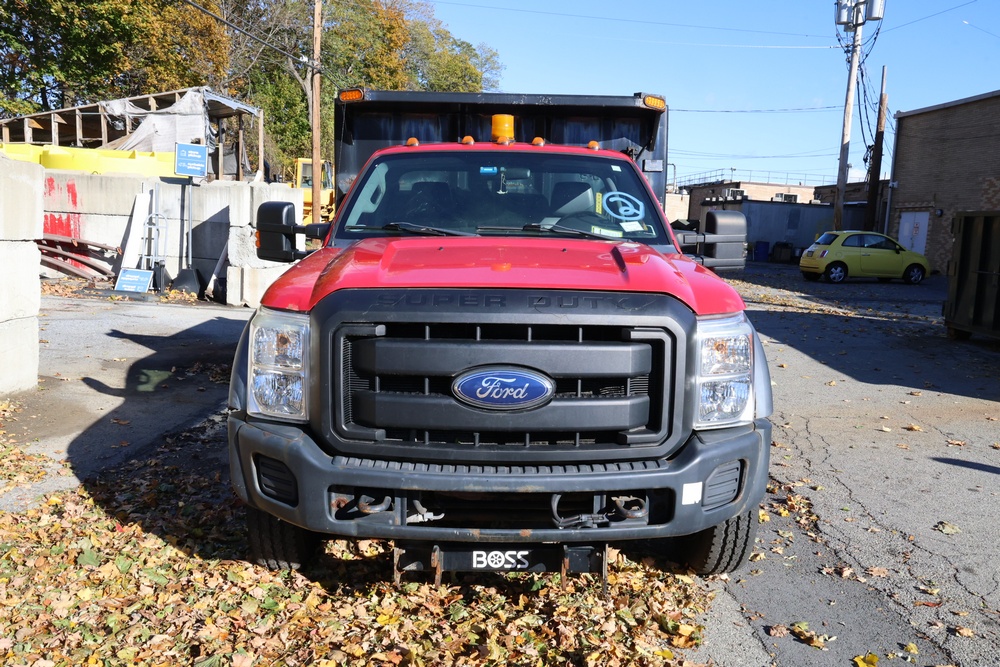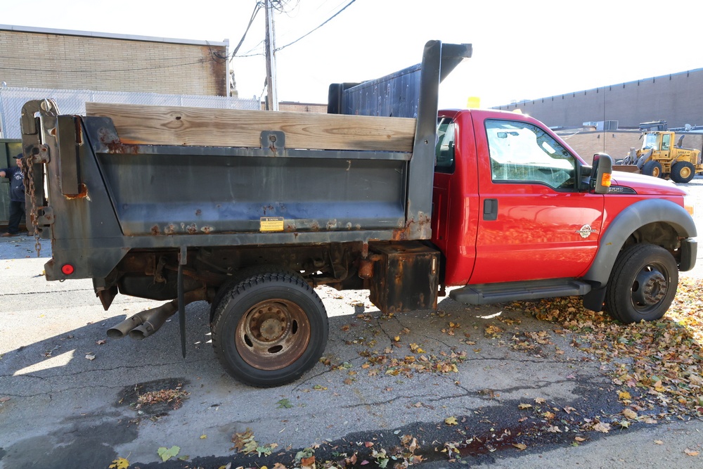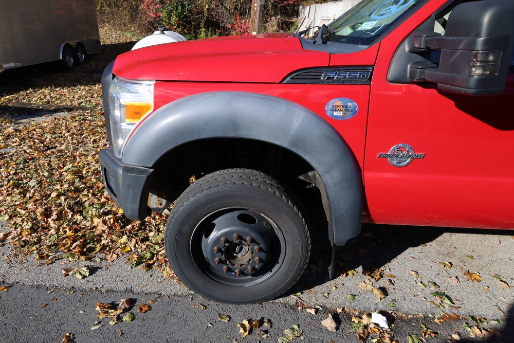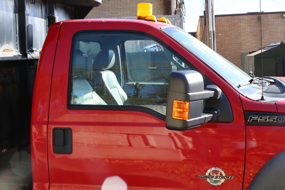 2011 Ford F-550 XL Super Duty dump truck with automatic transmission. VIN: 1FDUF5HT3BEA85817. Odometer reading: 41,788 miles. Exterior: Red cab with black dump body, dual rear wheels, front tow hooks, steel wheels, and amber roof light. Interior: Gray vinyl seat, black and gray dash trim, manual climate controls, factory radio, auxiliary switch panel, PTO and plow control levers, and column shifter. Tire configuration: Dual rear wheels with 225/70R19.5G tires. Additional equipment includes dump bed, PTO system (non-functional per seller), Certified Clean Idle engine badge, and side mirrors with integrated spot mirrors. Title and key available. Seller reports: Runs and drives.