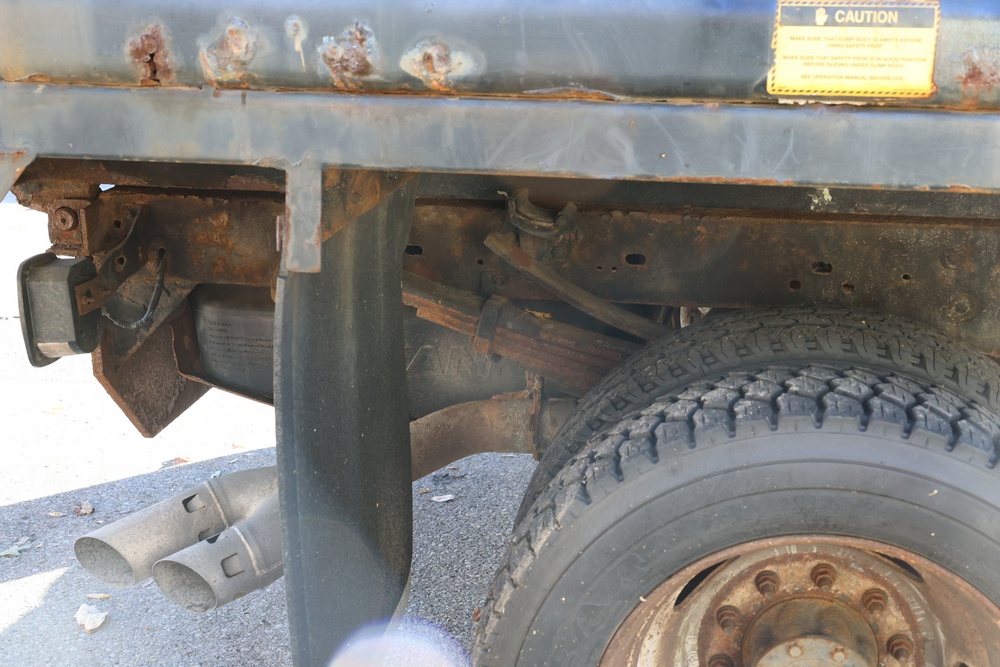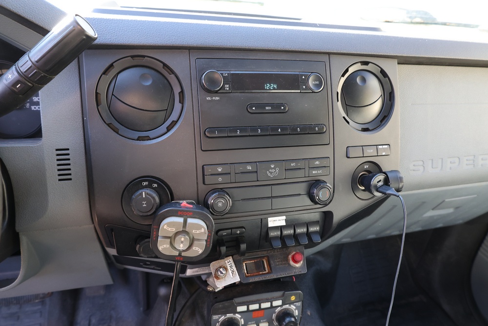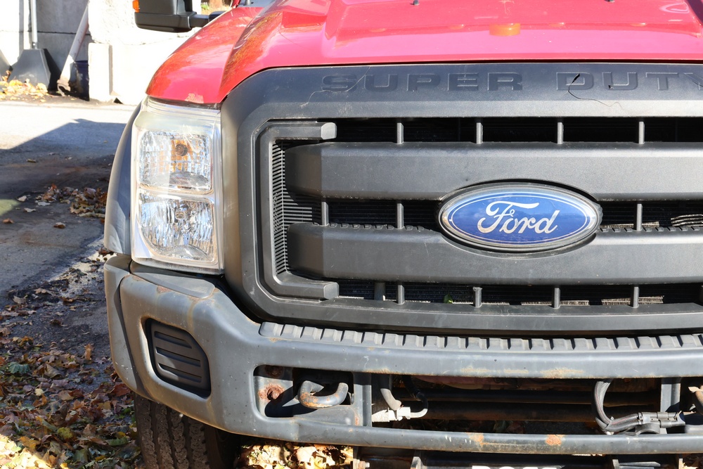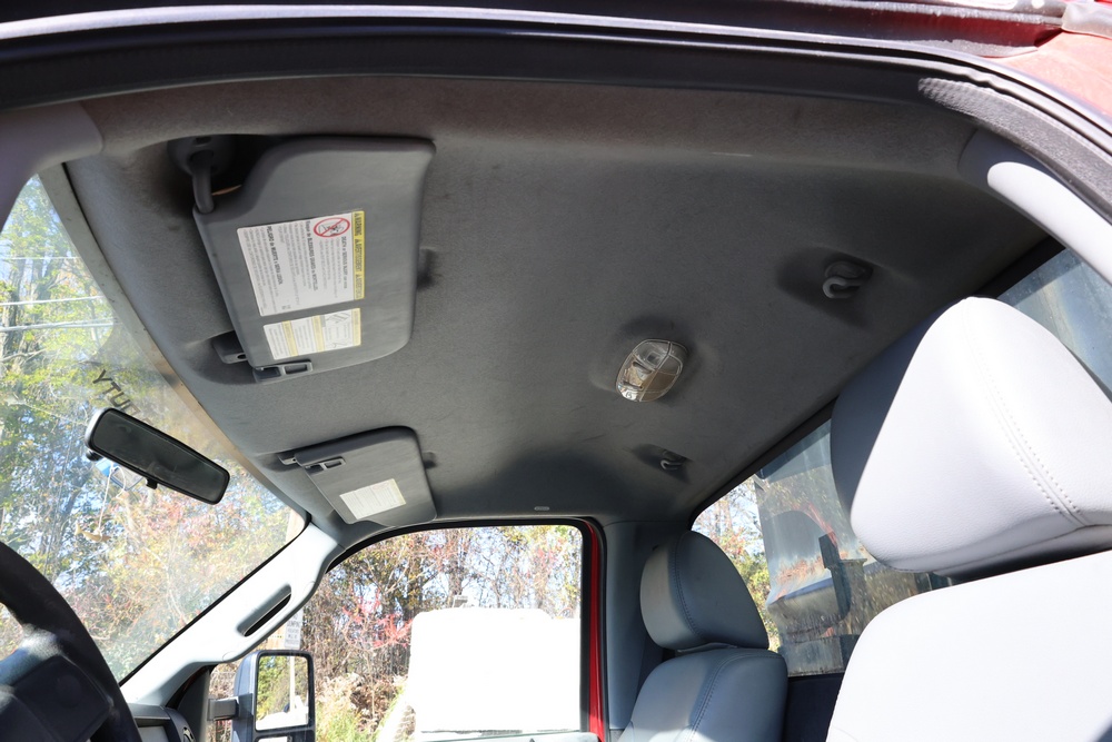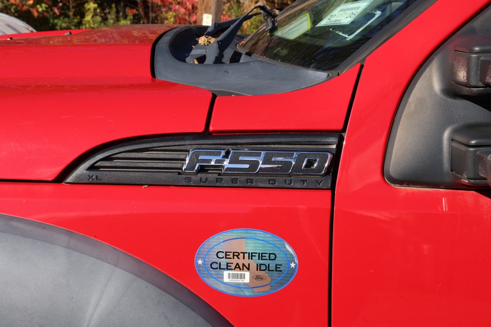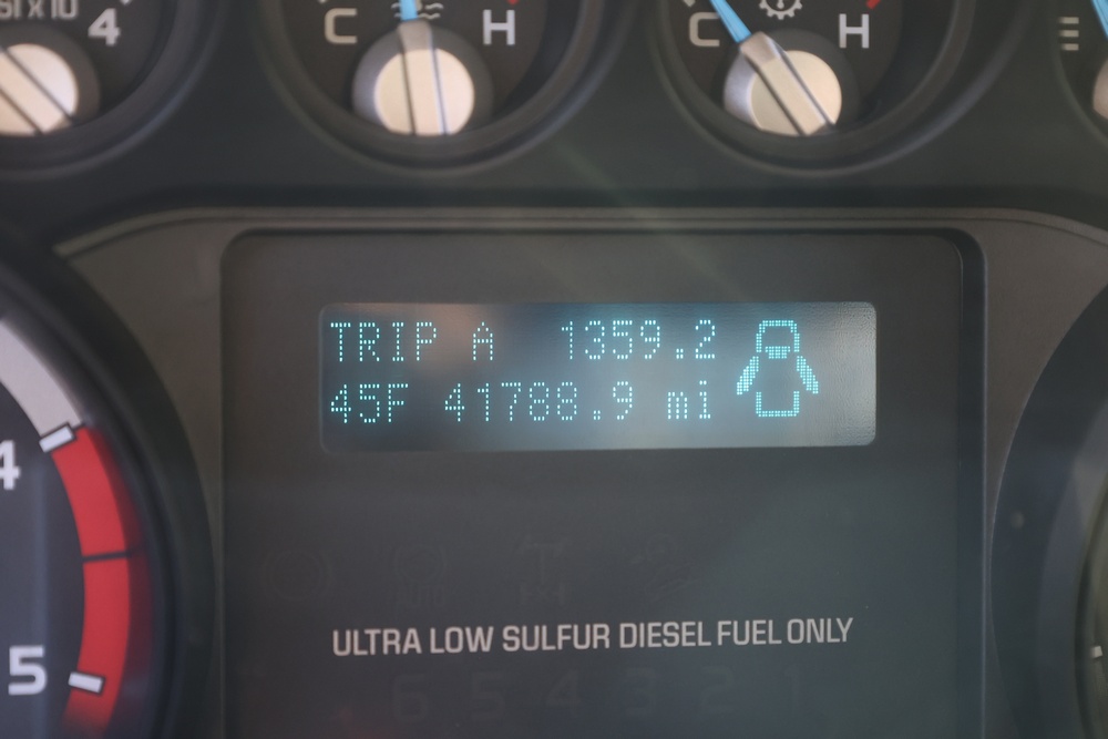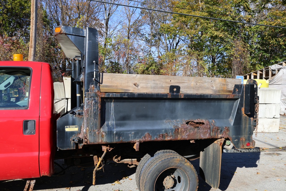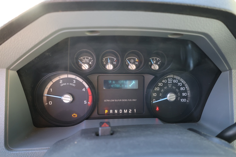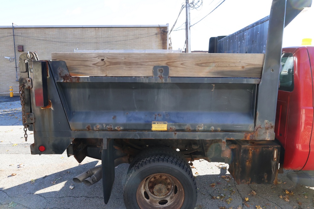 2011 Ford F-550 XL Super Duty dump truck with automatic transmission. VIN: 1FDUF5HT3BEA85817. Odometer reading: 41,788 miles. Exterior: Red cab with black dump body, dual rear wheels, front tow hooks, steel wheels, and amber roof light. Interior: Gray vinyl seat, black and gray dash trim, manual climate controls, factory radio, auxiliary switch panel, PTO and plow control levers, and column shifter. Tire configuration: Dual rear wheels with 225/70R19.5G tires. Additional equipment includes dump bed, PTO system (non-functional per seller), Certified Clean Idle engine badge, and side mirrors with integrated spot mirrors. Title and key available. Seller reports: Runs and drives.