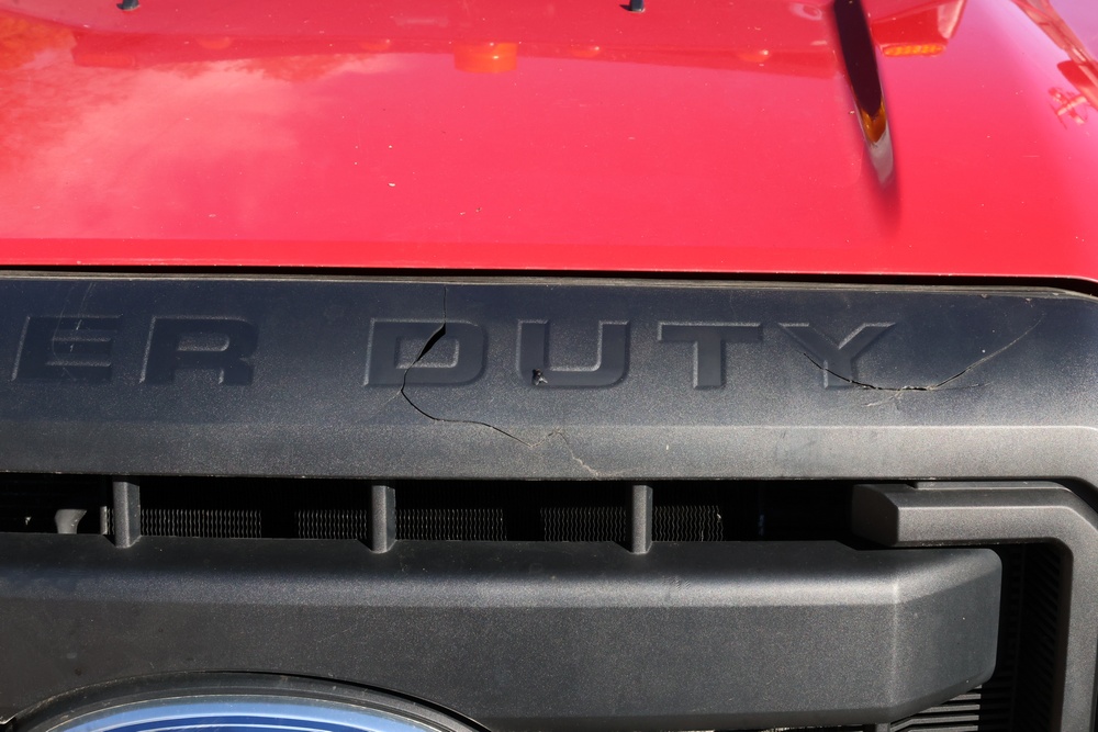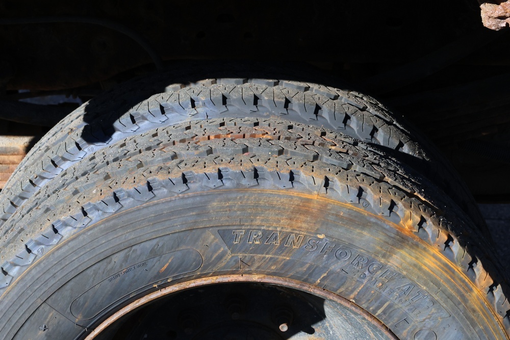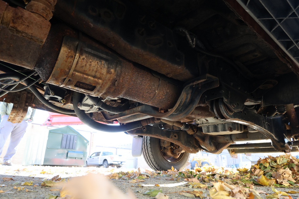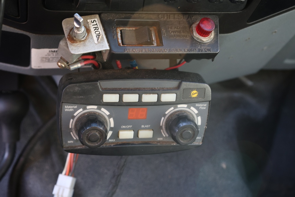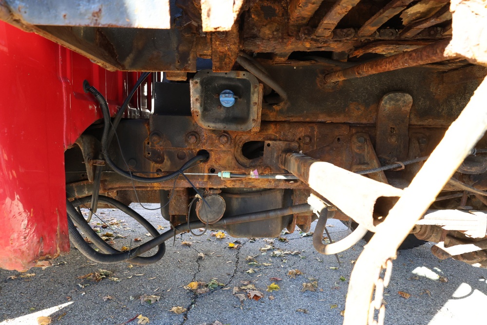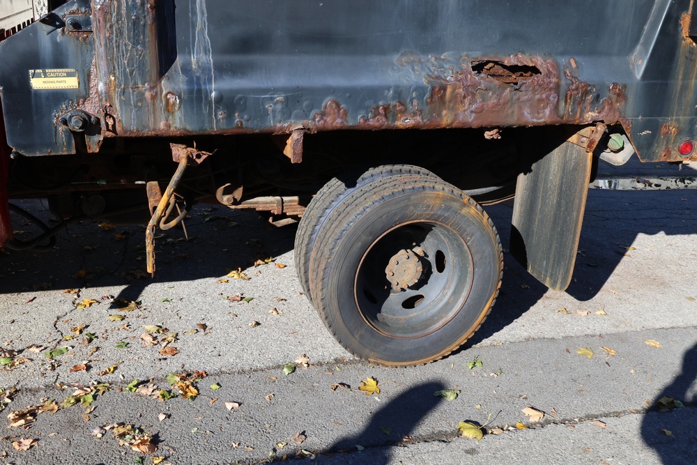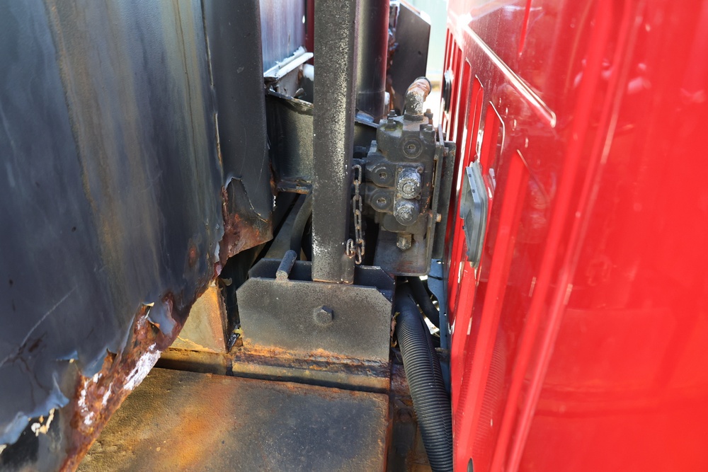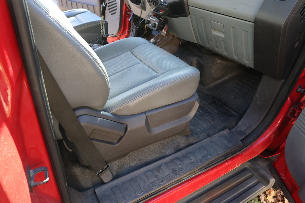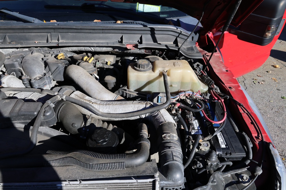 2011 Ford F-550 XL Super Duty dump truck with automatic transmission. VIN: 1FDUF5HT3BEA85817. Odometer reading: 41,788 miles. Exterior: Red cab with black dump body, dual rear wheels, front tow hooks, steel wheels, and amber roof light. Interior: Gray vinyl seat, black and gray dash trim, manual climate controls, factory radio, auxiliary switch panel, PTO and plow control levers, and column shifter. Tire configuration: Dual rear wheels with 225/70R19.5G tires. Additional equipment includes dump bed, PTO system (non-functional per seller), Certified Clean Idle engine badge, and side mirrors with integrated spot mirrors. Title and key available. Seller reports: Runs and drives.