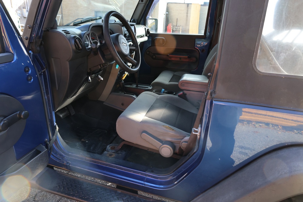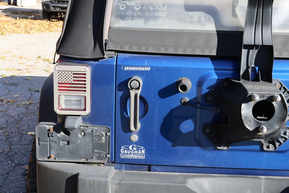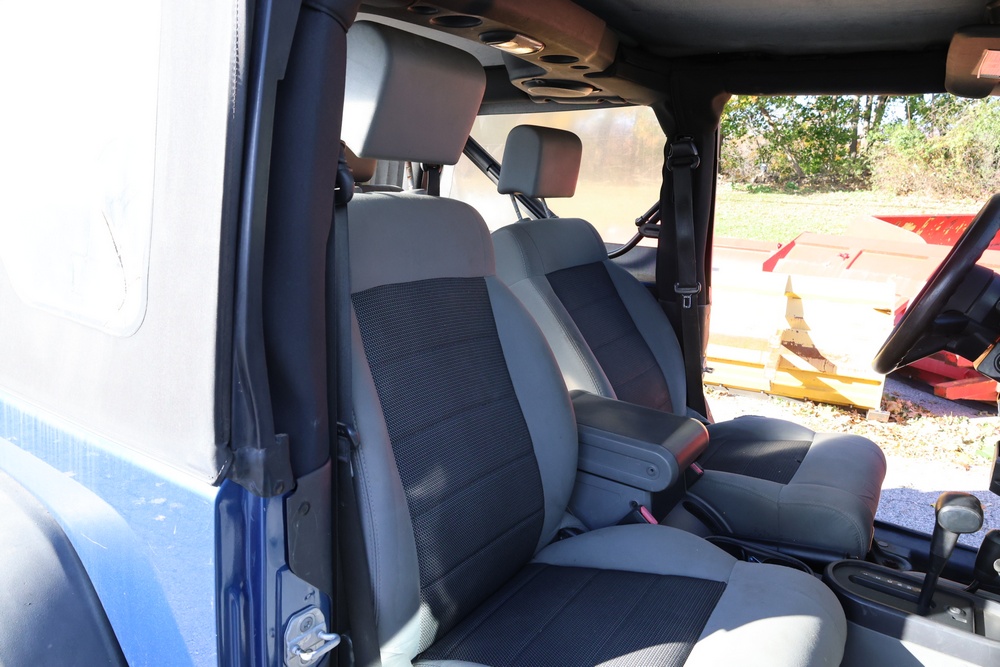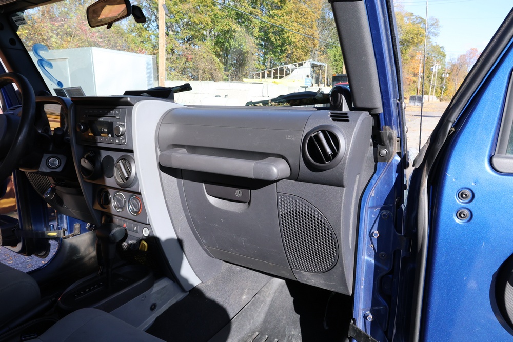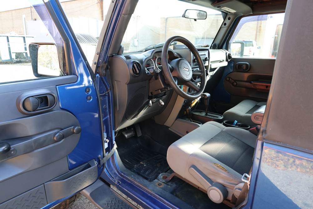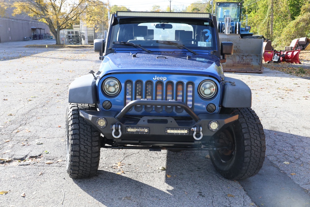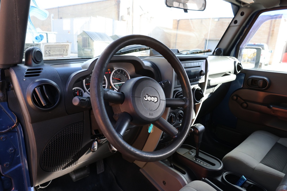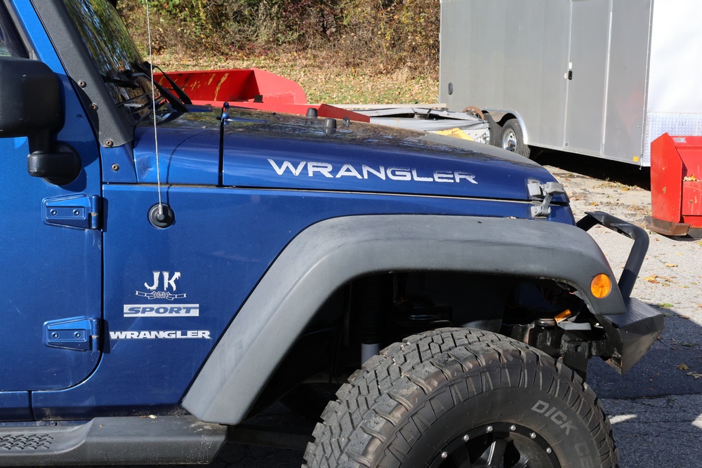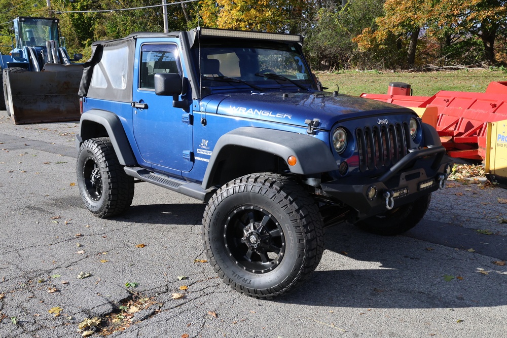 2010 Jeep Wrangler Sport 4x4 two-door SUV with automatic transmission. VIN: 1J4AA2D17AL176344. Odometer reading: 145,502. Exterior: Blue with black aftermarket front bumper, hood latches, soft top, light bar, and large off-road tires mounted on black wheels. Interior: Gray and black front bucket seats, center console, automatic shifter, and standard dashboard with factory gauges. Tire size: P225/75R16. Additional equipment includes light bar, custom front bumper with D-rings and fog lights, side steps, and "Trail Rated" and "JK Sport Wrangler" decals. Title and key available. Seller reports: Runs and drives, motor replaced approx. 500 miles ago.