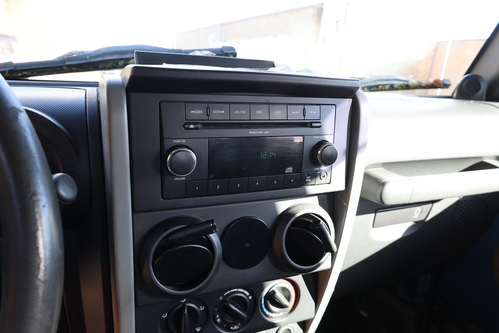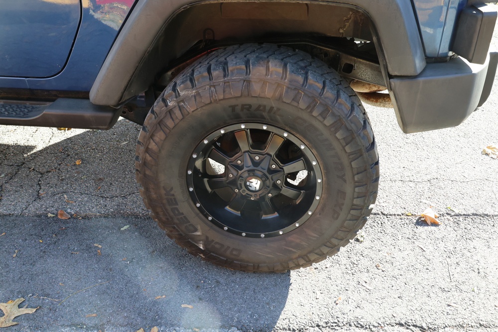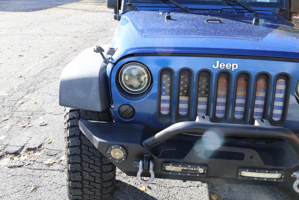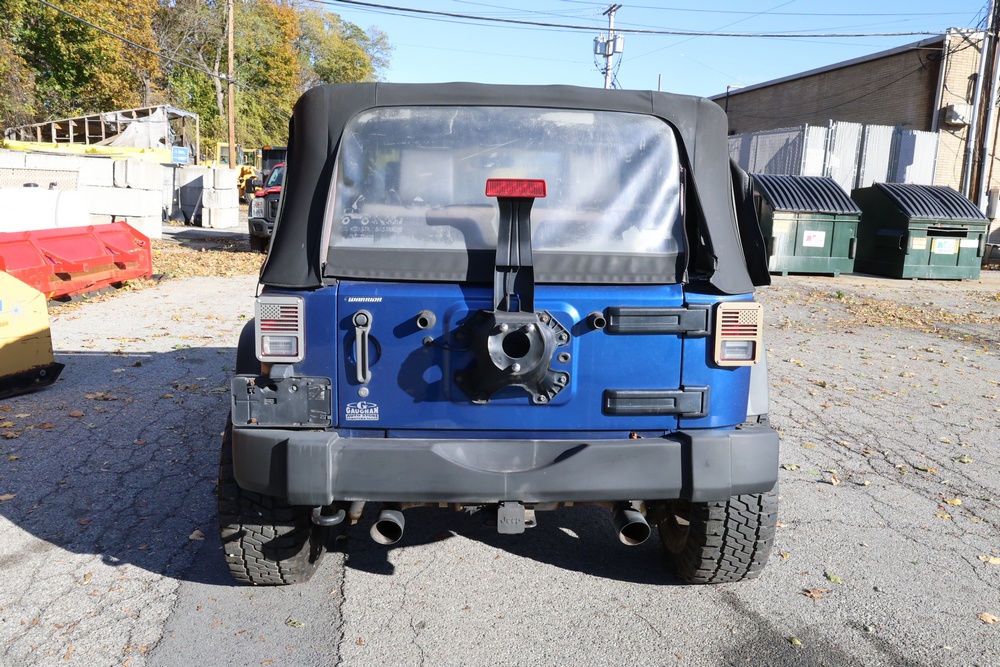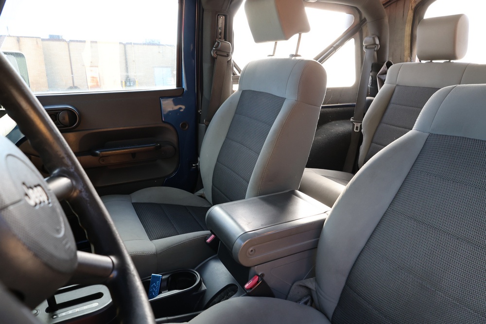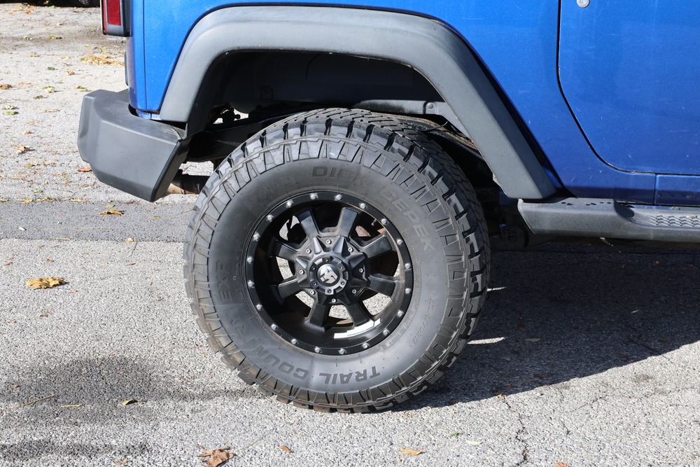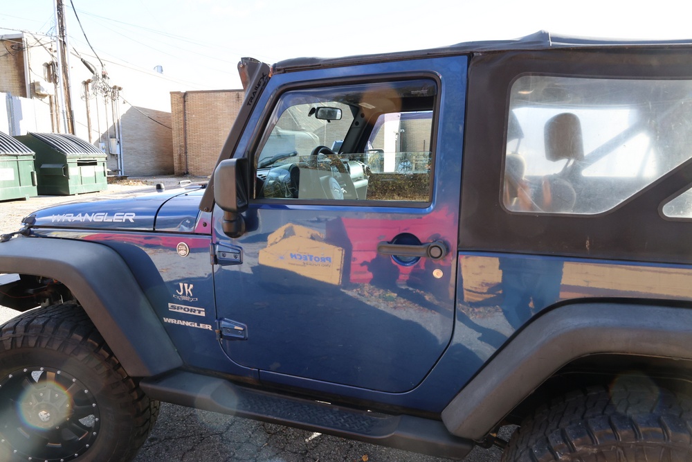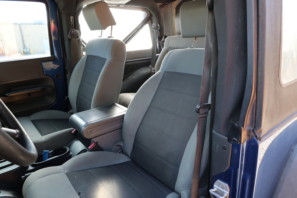 2010 Jeep Wrangler Sport 4x4 two-door SUV with automatic transmission. VIN: 1J4AA2D17AL176344. Odometer reading: 145,502. Exterior: Blue with black aftermarket front bumper, hood latches, soft top, light bar, and large off-road tires mounted on black wheels. Interior: Gray and black front bucket seats, center console, automatic shifter, and standard dashboard with factory gauges. Tire size: P225/75R16. Additional equipment includes light bar, custom front bumper with D-rings and fog lights, side steps, and "Trail Rated" and "JK Sport Wrangler" decals. Title and key available. Seller reports: Runs and drives, motor replaced approx. 500 miles ago.