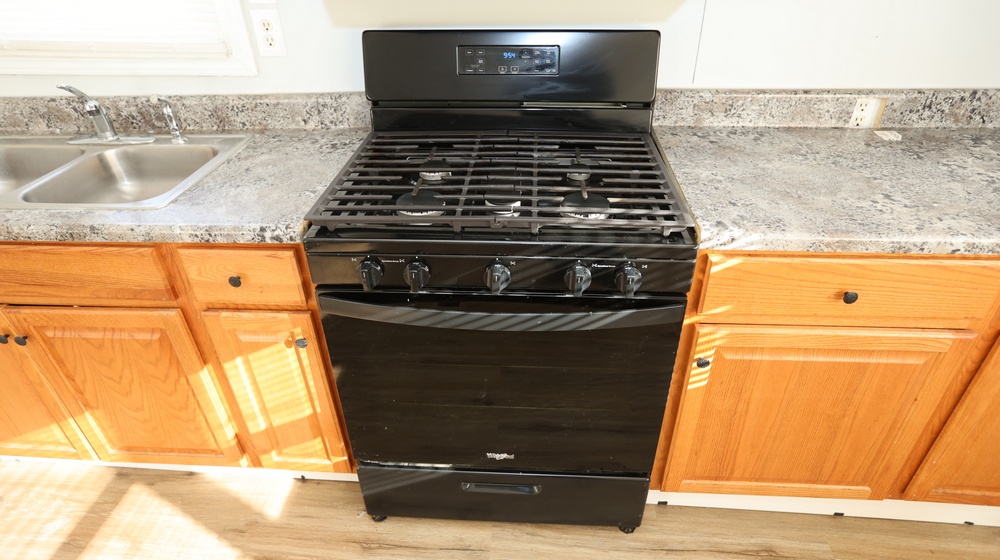 Inside features two bedrooms and one bathroom, vinyl plank-style flooring in the visible areas, painted walls, and multiple windows fitted with blinds. The kitchen contains wood cabinets, laminate-style countertops, and a double-basin sink. Also present are a free-standing Whirlpool gas range with model and serial information visible, a Vissani refrigerator/freezer (model MDF18SSR), and a range hood.
