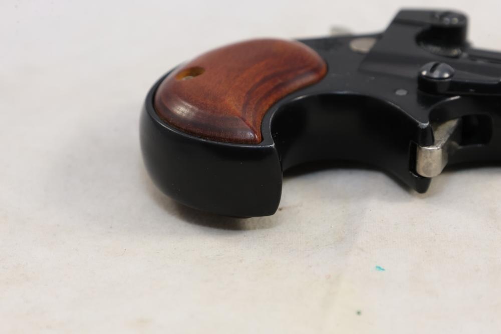 Davis Industries Model DM-22 over/under derringer chambered in .22 Magnum, with smooth wood grips and fixed sights. Serial Number 546067. All lots are subject to all applicable laws at the time of transfer. NOTE: Semi automatic rifles and all handguns require a license in NYS. There is a $35 transfer fee per long gun. There is a $40 transfer fee per hand gun. There is a $20 transfer fee per ammunition lot. If you fail the background check, the transfer fee still applies, and you are still required to make payment and then reconsign the lot to auction. FFL dealers are not exempt from these fees. A background check will be required for all buyers purchasing a firearm and/or ammunition. NYS charges a background check fee for all firearms and ammunition. The fee is $9 for firearms and $2.50 for ammunition. The NYS fee is per background check NOT per lot, will be collected directly by Civil Armory, and is in addition to any transfer All lots are subject to all applicable laws at the time of transfer. NOTE: Semi automatic rifles and all handguns require a license in NYS. There is a $35 transfer fee per long gun. There is a $40 transfer fee per hand gun. There is a $20 transfer fee per ammunition lot. If you fail the background check, the transfer fee still applies, and you are still required to make payment and then reconsign the lot to auction. FFL dealers are not exempt from these fees. A background check will be required for all buyers purchasing a firearm and/or ammunition. NYS charges a background check fee for all firearms and ammunition. The fee is $9 for firearms and $2.50 for ammunition. The NYS fee is per background check NOT per lot, will be collected directly by Civil Armory, and is in addition to any transfer