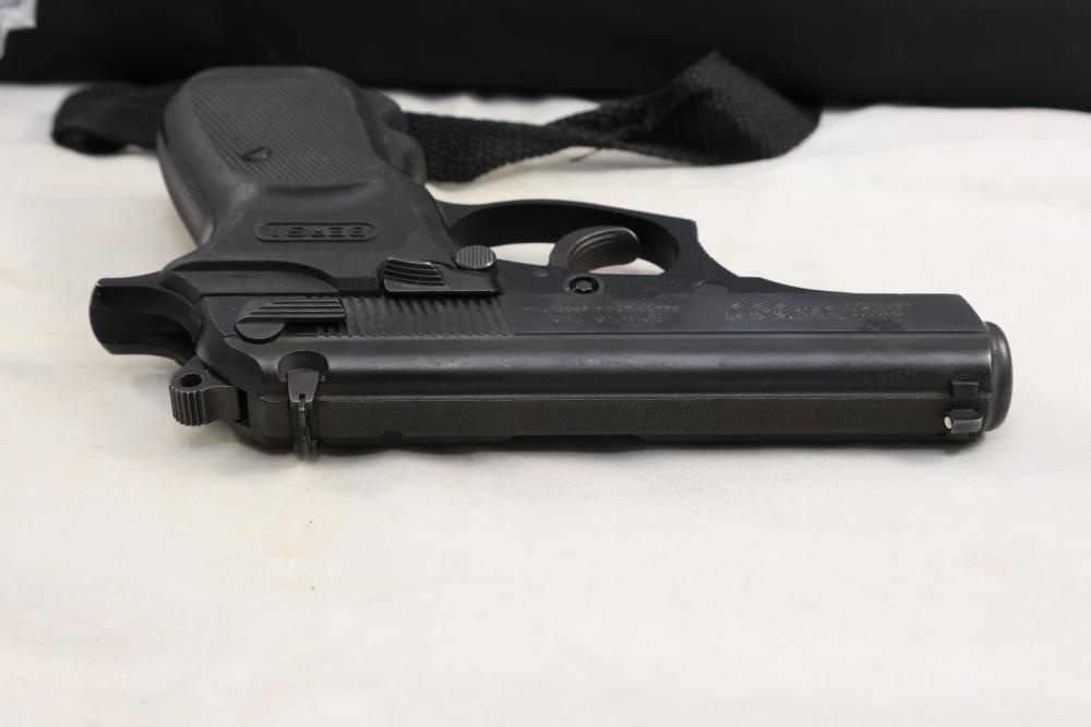 Bersa Thunder 380 semi-automatic pistol chambered in .380 ACP, with a black synthetic grip, and standard fixed sights; Serial Number D06936, and comes with two magazines, an extra wood grip set, a soft case, and a manual. All lots are subject to all applicable laws at the time of transfer. NOTE: Semi automatic rifles and all handguns require a license in NYS. There is a $35 transfer fee per long gun. There is a $40 transfer fee per hand gun. There is a $20 transfer fee per ammunition lot. If you fail the background check, the transfer fee still applies, and you are still required to make payment and then reconsign the lot to auction. FFL dealers are not exempt from these fees. A background check will be required for all buyers purchasing a firearm and/or ammunition. NYS charges a background check fee for all firearms and ammunition. The fee is $9 for firearms and $2.50 for ammunition. The NYS fee is per background check NOT per lot, will be collected directly by Civil Armory, and is in addition to any transfer All lots are subject to all applicable laws at the time of transfer. NOTE: Semi automatic rifles and all handguns require a license in NYS. There is a $35 transfer fee per long gun. There is a $40 transfer fee per hand gun. There is a $20 transfer fee per ammunition lot. If you fail the background check, the transfer fee still applies, and you are still required to make payment and then reconsign the lot to auction. FFL dealers are not exempt from these fees. A background check will be required for all buyers purchasing a firearm and/or ammunition. NYS charges a background check fee for all firearms and ammunition. The fee is $9 for firearms and $2.50 for ammunition. The NYS fee is per background check NOT per lot, will be collected directly by Civil Armory, and is in addition to any transfer