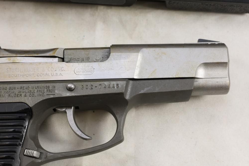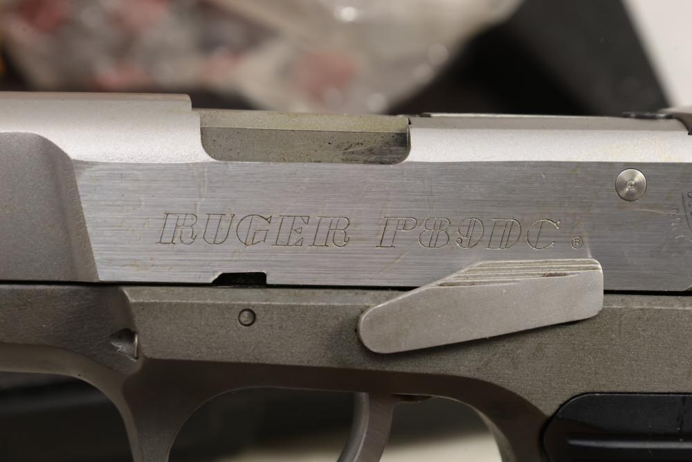 Ruger P89DC semi-automatic pistol chambered in 9mm x 19, with black checkered synthetic grips. Serial Number 302-74445. Accessories include a hard plastic case, paperwork, and one additional magazine. All lots are subject to all applicable laws at the time of transfer. NOTE: Semi automatic rifles and all handguns require a license in NYS. There is a $35 transfer fee per long gun. There is a $40 transfer fee per hand gun. There is a $20 transfer fee per ammunition lot. If you fail the background check, the transfer fee still applies, and you are still required to make payment and then reconsign the lot to auction. FFL dealers are not exempt from these fees. A background check will be required for all buyers purchasing a firearm and/or ammunition. NYS charges a background check fee for all firearms and ammunition. The fee is $9 for firearms and $2.50 for ammunition. The NYS fee is per background check NOT per lot, will be collected directly by Civil Armory, and is in addition to transfer fees. All lots are subject to all applicable laws at the time of transfer. NOTE: Semi automatic rifles and all handguns require a license in NYS. There is a $35 transfer fee per long gun. There is a $40 transfer fee per hand gun. There is a $20 transfer fee per ammunition lot. If you fail the background check, the transfer fee still applies, and you are still required to make payment and then reconsign the lot to auction. FFL dealers are not exempt from these fees. A background check will be required for all buyers purchasing a firearm and/or ammunition. NYS charges a background check fee for all firearms and ammunition. The fee is $9 for firearms and $2.50 for ammunition. The NYS fee is per background check NOT per lot, will be collected directly by Civil Armory, and is in addition to transfer fees.