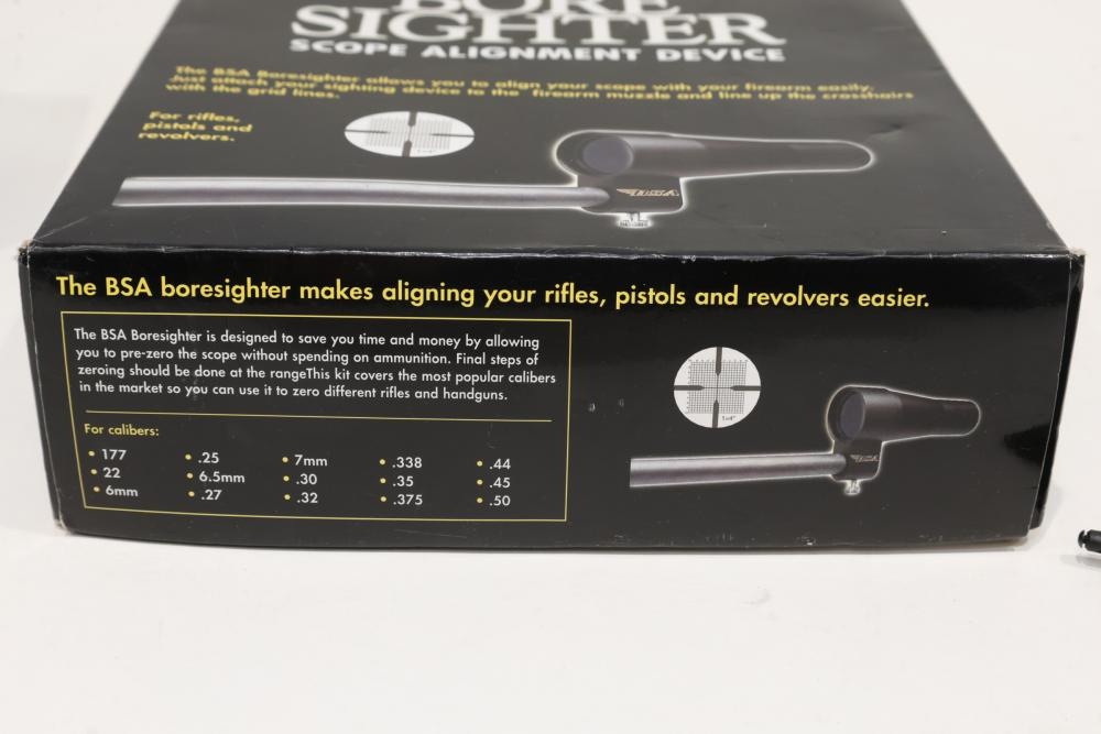 Barska Electro Sight 1×30 mm red-dot optic (model AC10984) with original box, foam insert, and paperwork, plus a BSA boresighter kit (model BS30SGA) with 30 mm collimator, 16 studs, hard case, adjustable 20–12 ga bore stud, and accessories. Includes an additional laser boresighter with carrying pouch. All lots are subject to all applicable laws at the time of transfer. NOTE: Semi automatic rifles and all handguns require a license in NYS. There is a $35 transfer fee per long gun. There is a $40 transfer fee per hand gun. There is a $20 transfer fee per ammunition lot. If you fail the background check, the transfer fee still applies, and you are still required to make payment and then reconsign the lot to auction. FFL dealers are not exempt from these fees. A background check will be required for all buyers purchasing a firearm and/or ammunition. NYS charges a background check fee for all firearms and ammunition. The fee is $9 for firearms and $2.50 for ammunition. The NYS fee is per background check NOT per lot, will be collected directly by Civil Armory, and is in addition to any transfer All lots are subject to all applicable laws at the time of transfer. NOTE: Semi automatic rifles and all handguns require a license in NYS. There is a $35 transfer fee per long gun. There is a $40 transfer fee per hand gun. There is a $20 transfer fee per ammunition lot. If you fail the background check, the transfer fee still applies, and you are still required to make payment and then reconsign the lot to auction. FFL dealers are not exempt from these fees. A background check will be required for all buyers purchasing a firearm and/or ammunition. NYS charges a background check fee for all firearms and ammunition. The fee is $9 for firearms and $2.50 for ammunition. The NYS fee is per background check NOT per lot, will be collected directly by Civil Armory, and is in addition to any transfer