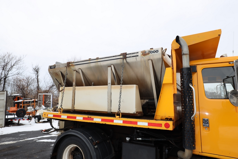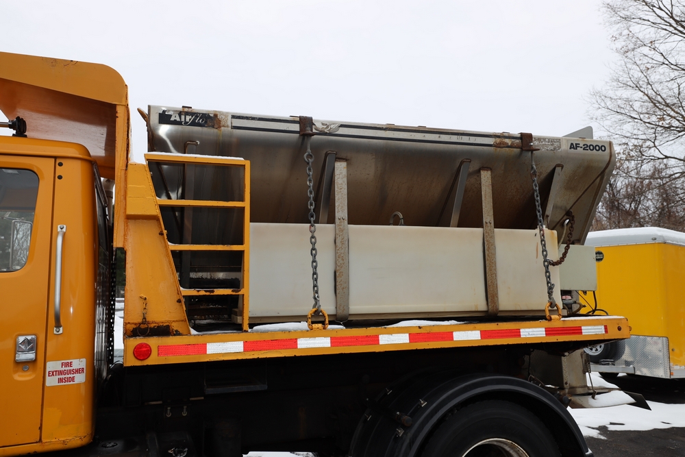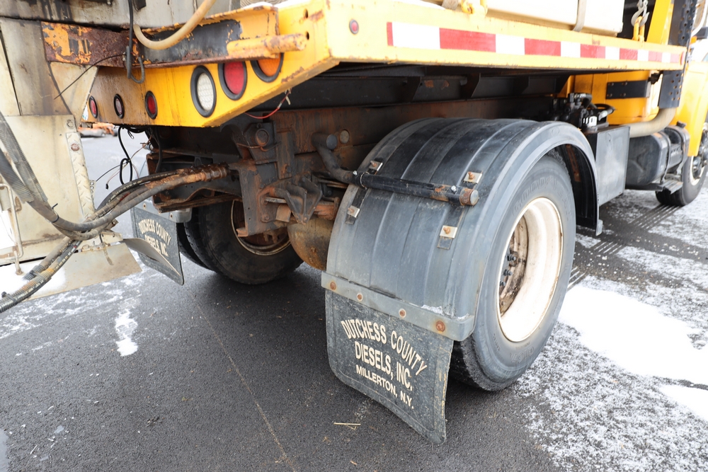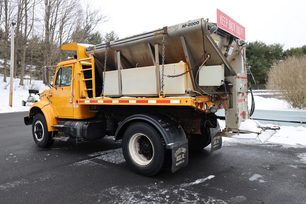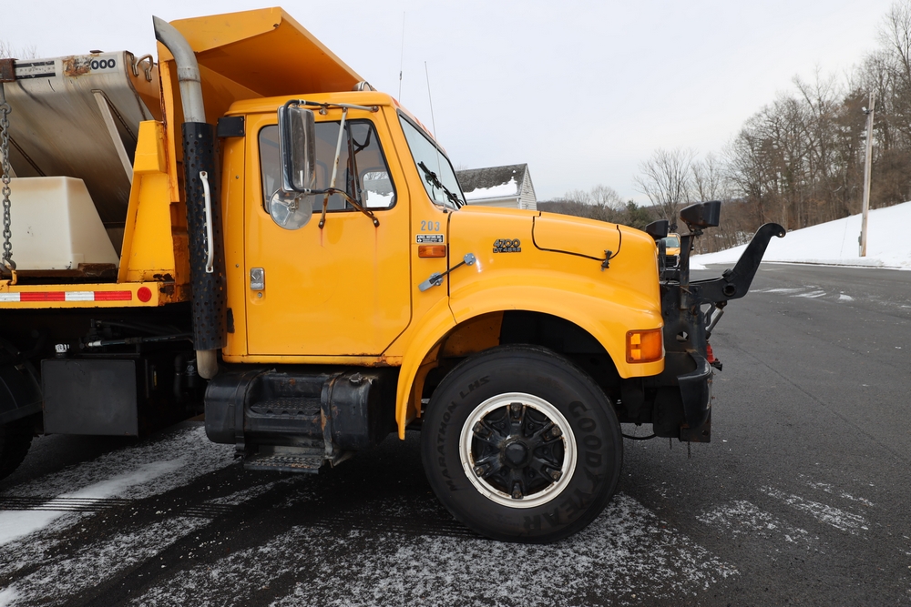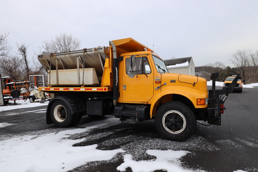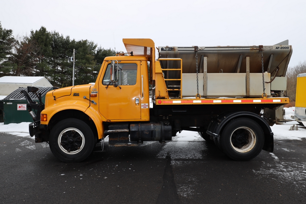 1998 International 4700 dump truck. VIN: 1HTSCAAR7WH509471. Body: Chassis 2D. Engine: 7.6L I6 DI Diesel. Odometer reading: 38902, Hours reading: 5196. Runs, drives. Air Flo Spreader. Front plow lift cylinder sticking and leaking. Title & key available. Location: Mid Hudson.