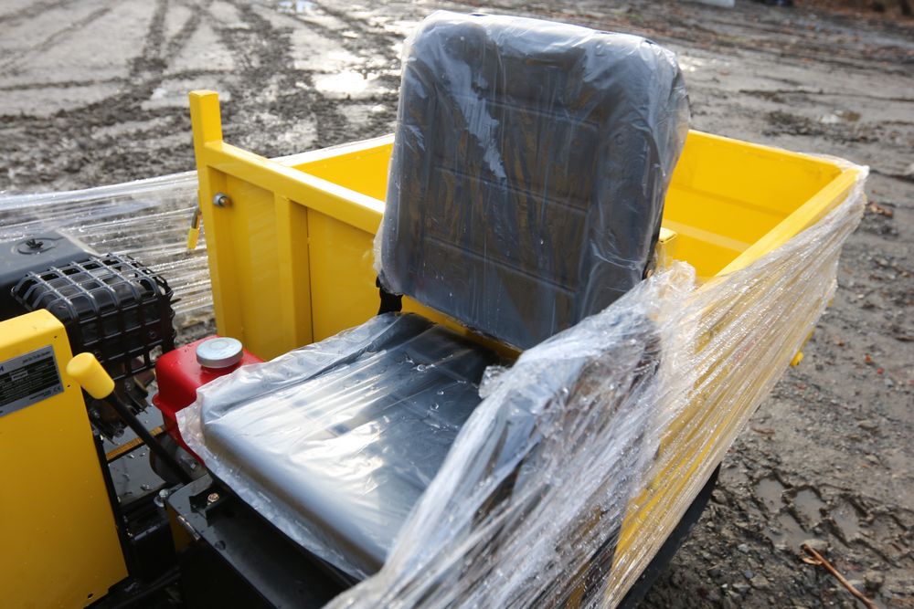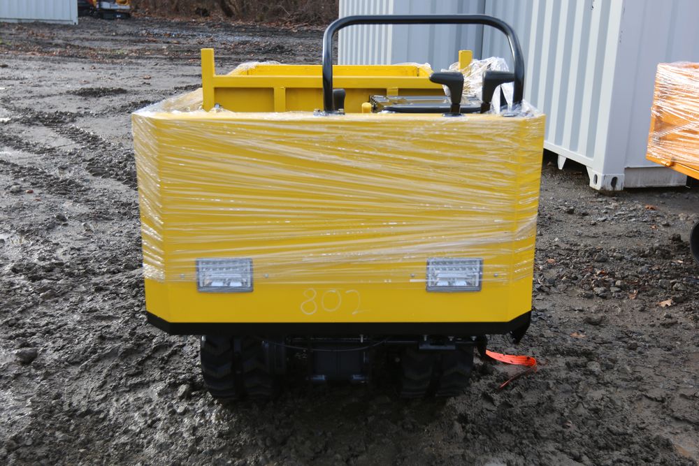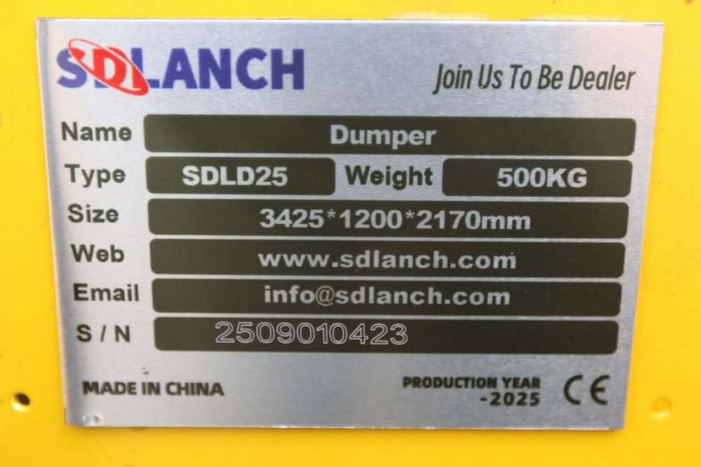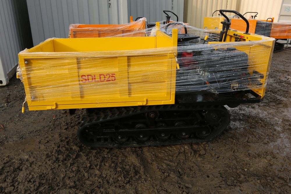 New 2025 tracked dumper model SDLD25 with a high-sided yellow steel cargo bed and rear-mounted engine. Features a single-operator seat with control levers, and rubber tracks for enhanced mobility on rough terrain.