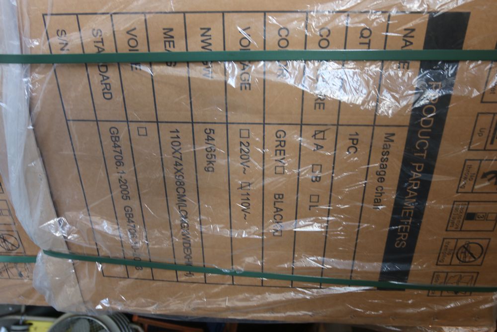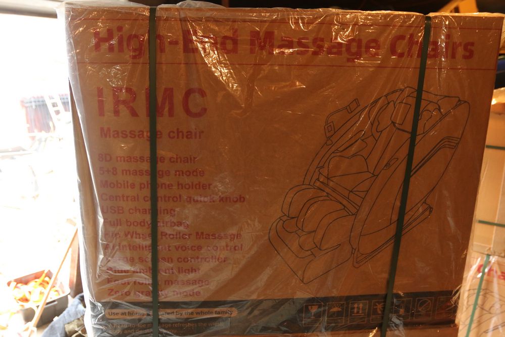 New 2025 IRMC high-end massage chair in retail packaging features like intelligent voice control, foot roller massage, zero-gravity mode, extended roller and airbag massage zones for head-to-toe coverage. New in box.