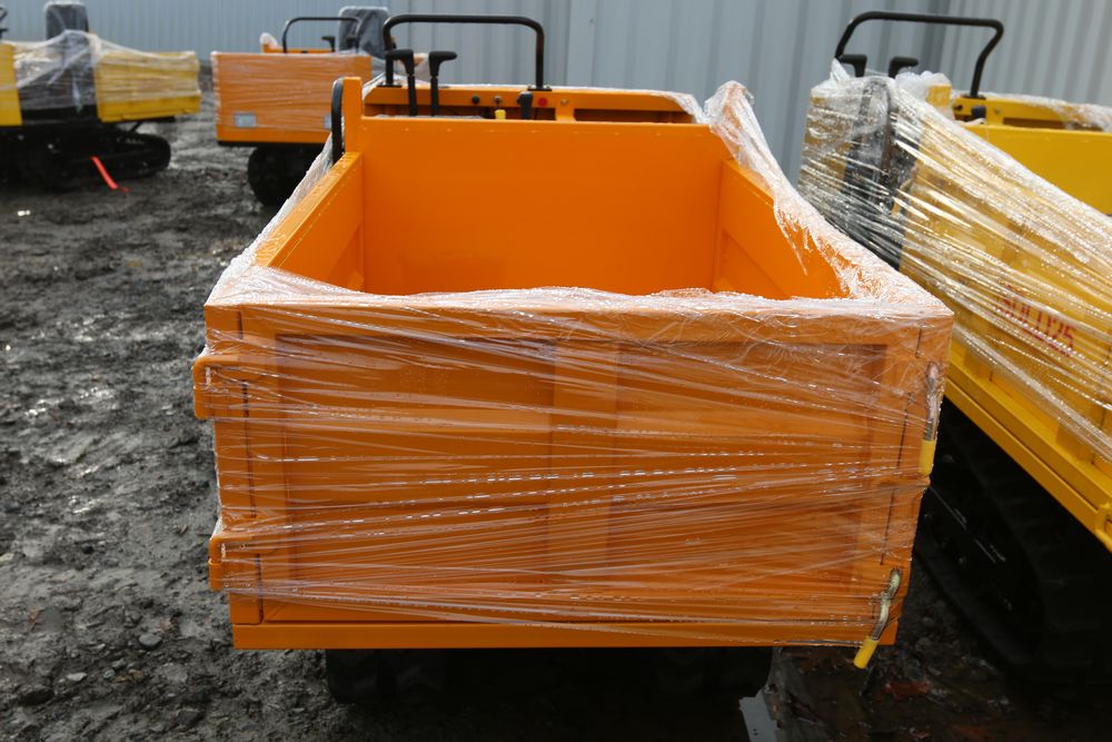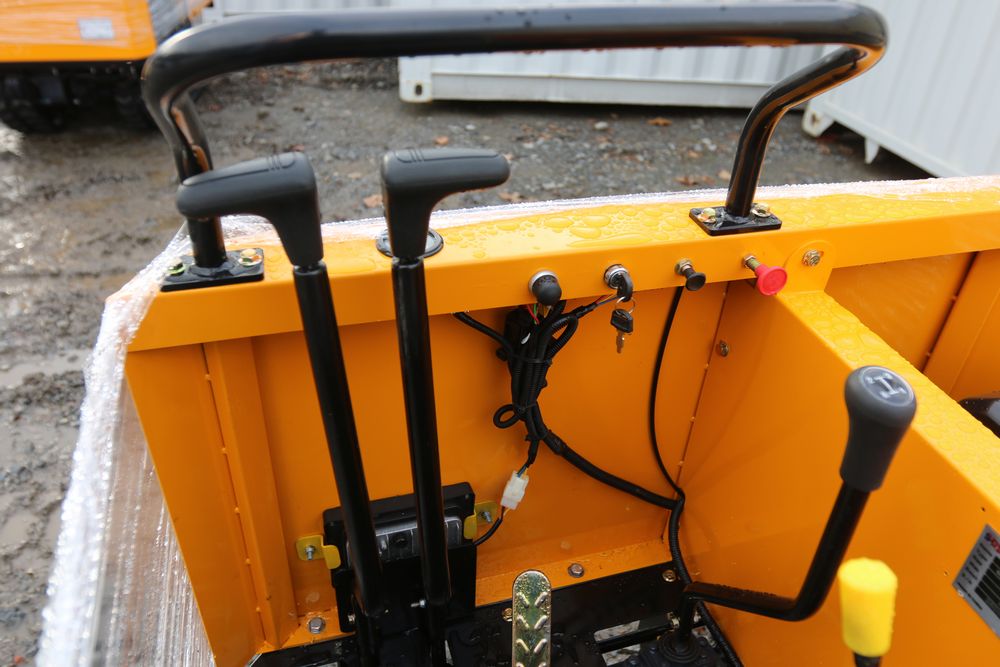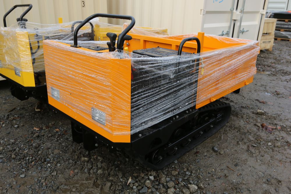 New 2025 tracked dumper model SDLD25 with a high-sided yellow steel cargo bed and rear-mounted engine. Features a single-operator seat with control levers, and rubber tracks for enhanced mobility on rough terrain.