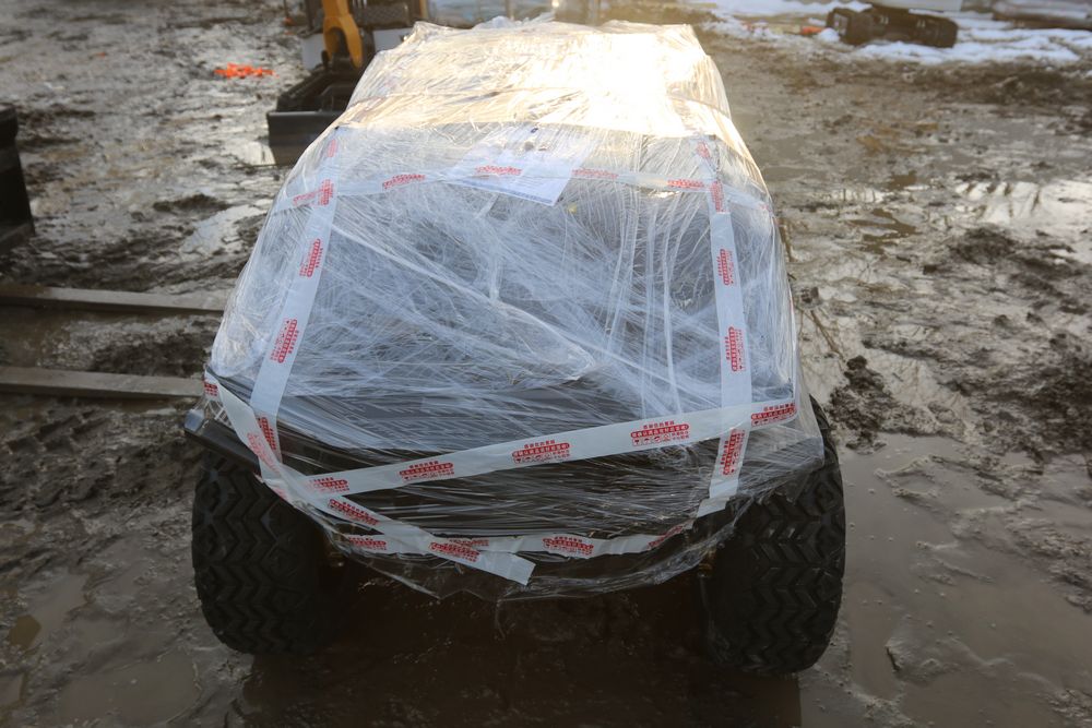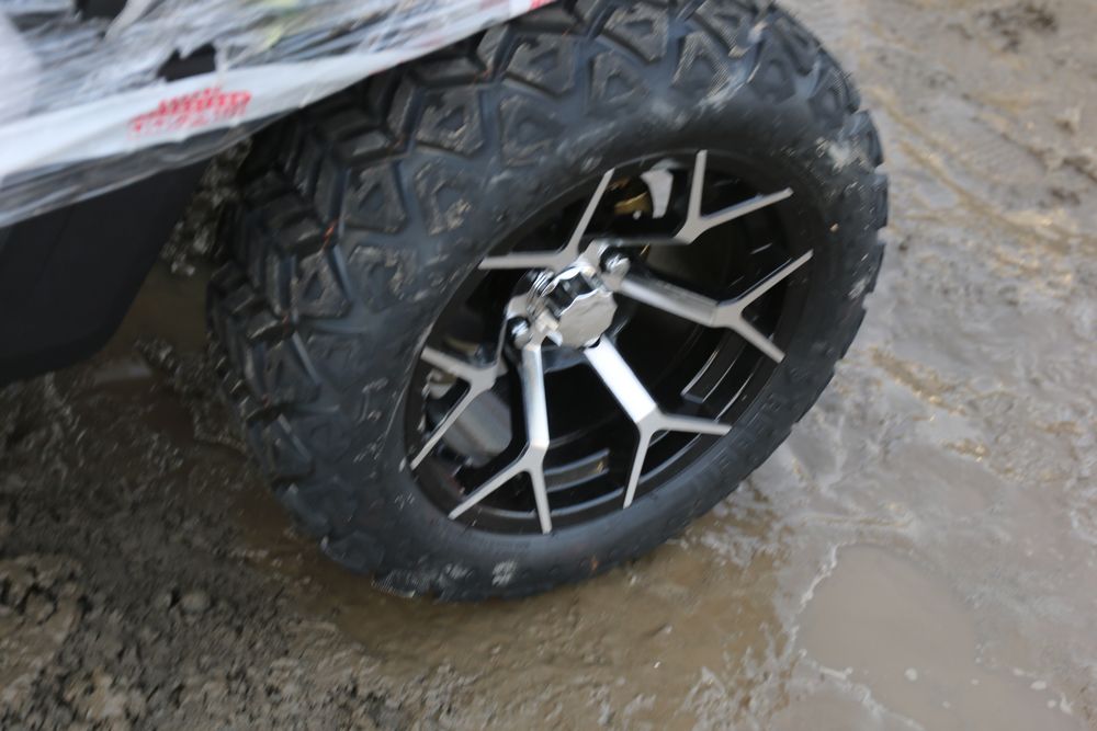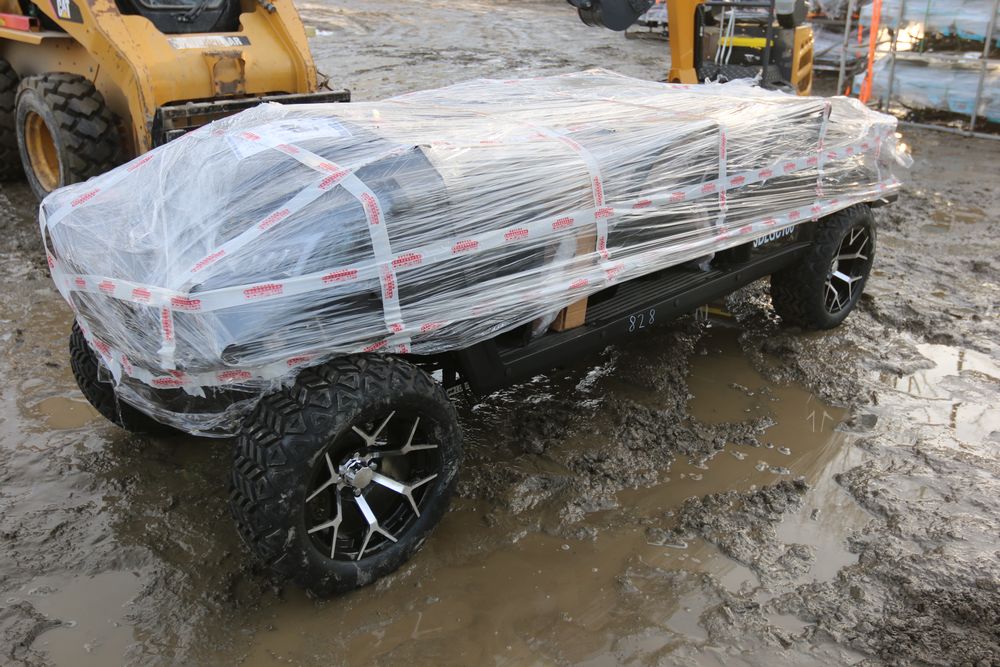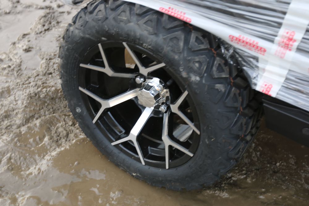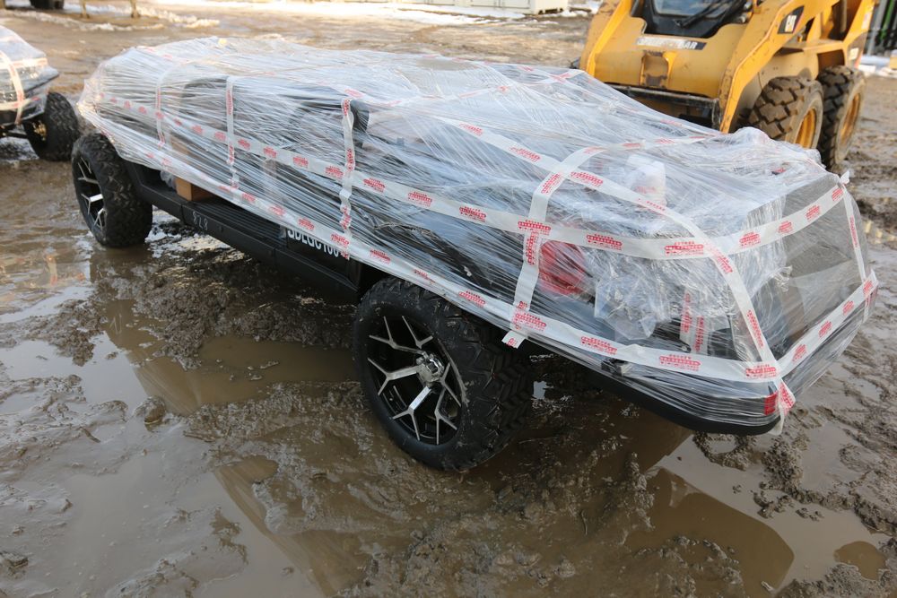 New 2025 electric golf cart model SDLGC100 with DOT acrylic foldable windshield, six luxury seats with headrests, foldable rear seat, 14in off-road tires, 10.1-inch display, and 5000W Ac motor. Comes disassembled. Appearing to have all parts included.