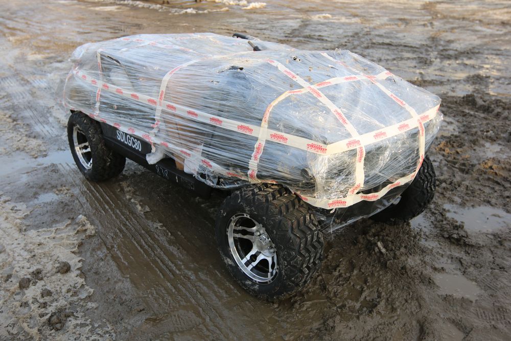 New 2025 IR golf cart model SDLG80, seats four, top speed of 23-24mph, 4KW AC motor, canopy cover, front window, brush guard.. Comes disassembled, appearing to be complete.
