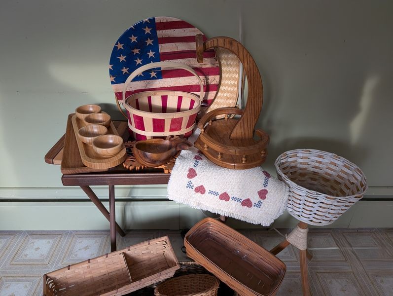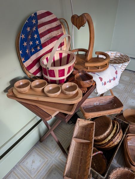 Vintage Wicker Baskets, Folding Table. Approx two dozen baskets ranging from 8"x6"x7"H to 9"x13"x7"H; banana stand, 14"H; folding snack table; linens.