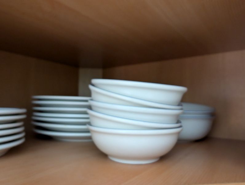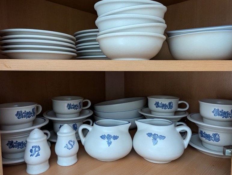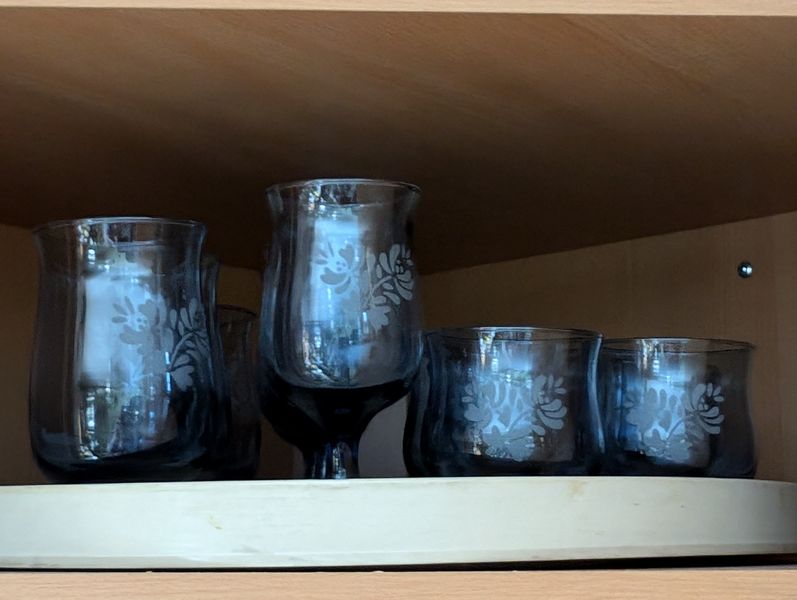 Pfaltzgraff Dishes and Glasses. Glasses (smokey-blue) incl: juice (6), wine (6), iced tea (4); "Yorktown" dishes, 42 pieces, incl plates, bowls, cups, saucers. S&P, creamers. See photos for details.