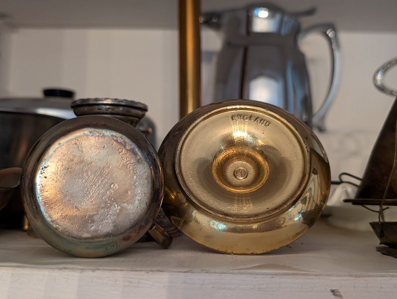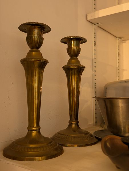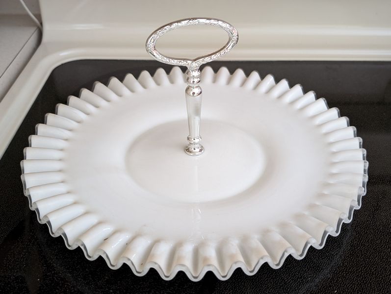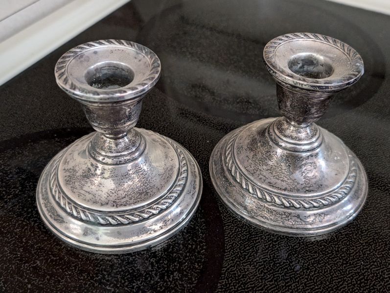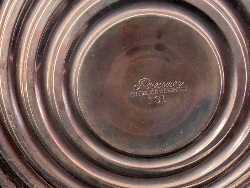 Vintage Metal Entertaining. Incl: candlesticks, incl pair o f brass, ea 8"H; pr Presiner sterling weighted, ec 3.5"H; Fenton scalloped dish, 12.5"diam; cov cake dish; carafe; candy dishes; more. See photos maker's marks.