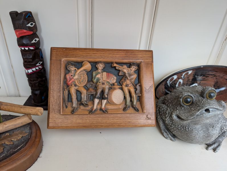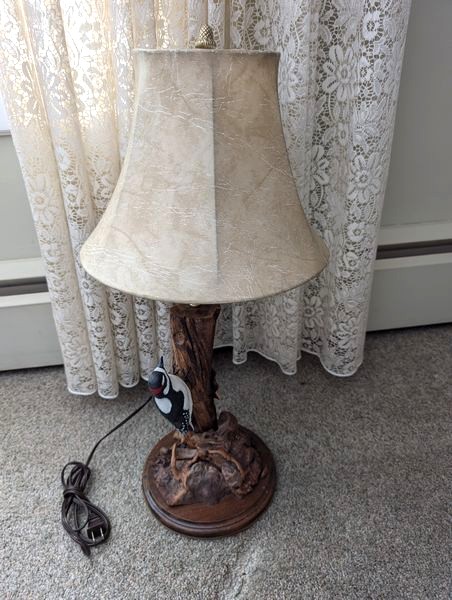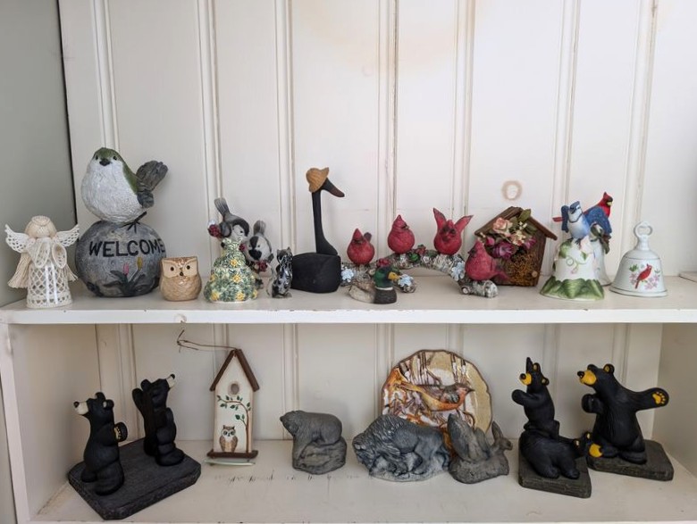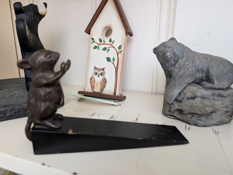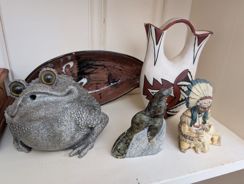 Animal Décor and Lamps. Wood wall art, 18"Wx13"H; table lamps 22"H & 2'H with shades; peace pipe, 22"L; cat décor, 18"H; also incl: birds; bears; frog; turtle; sheep; dog; mouse door stop; more! See photos.