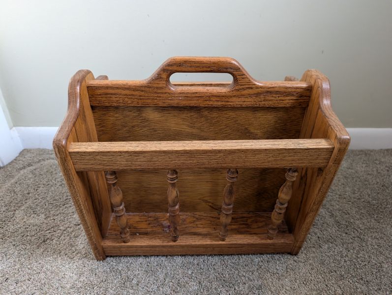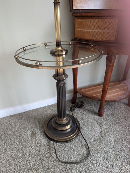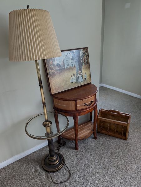 Small Furniture. Demilune single-drawer table with bamboo, 23"Wx1'Dx28"H; wall art of children playing, 2'Wx18"H; lamp table, 59"H with 16" round glass table; mag holder.
