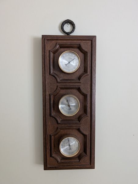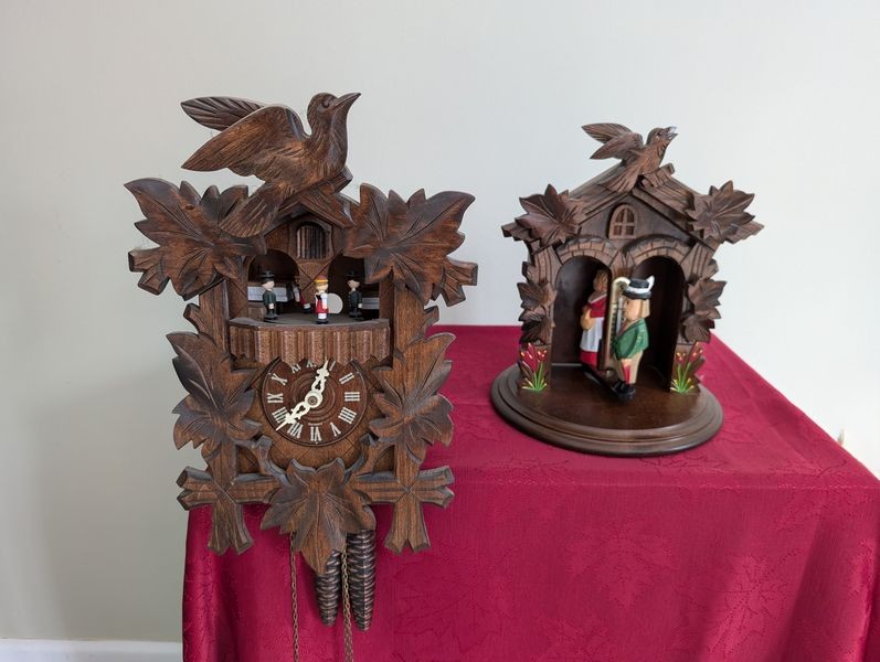 Quality Clocks, Barometer, featuring Howard Miller. Black Forest cuckoo clock with manual, 8"Wx1'H; coord Bavarian weather house, 9"Wx1'H; Howard Miller mantle clock, 8"Wx5"Dx10"H; wall barometer, 7"Wx19"H. See photos for more details.
