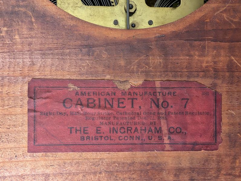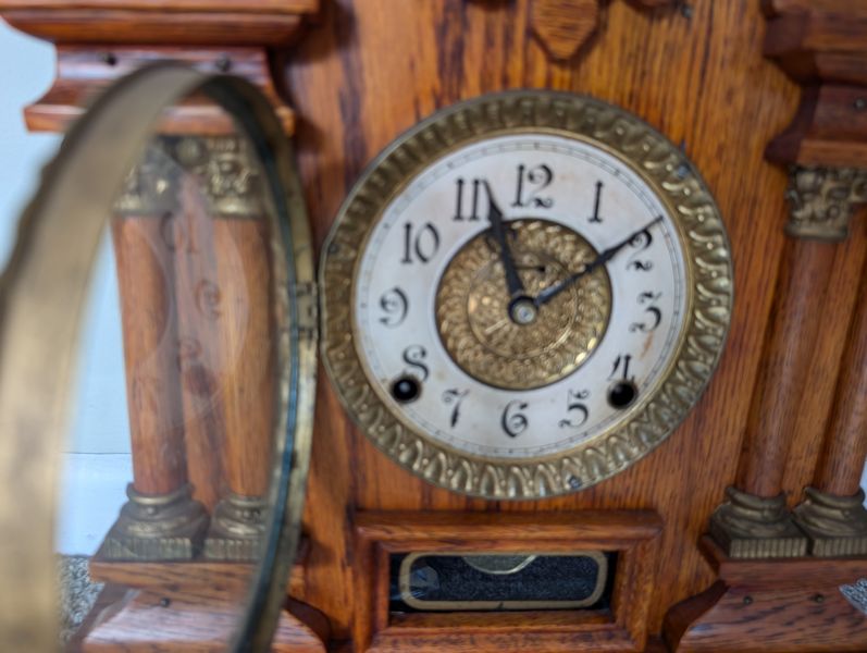 Highly Carved Eight-Day Mantle Clock. The E. Ingraham Co (Bristol, CT) heavily carved wood eight-day mantle clock with brass key. Cabinet no. 7. See photos for details & mechanics.