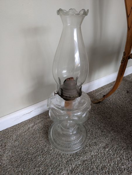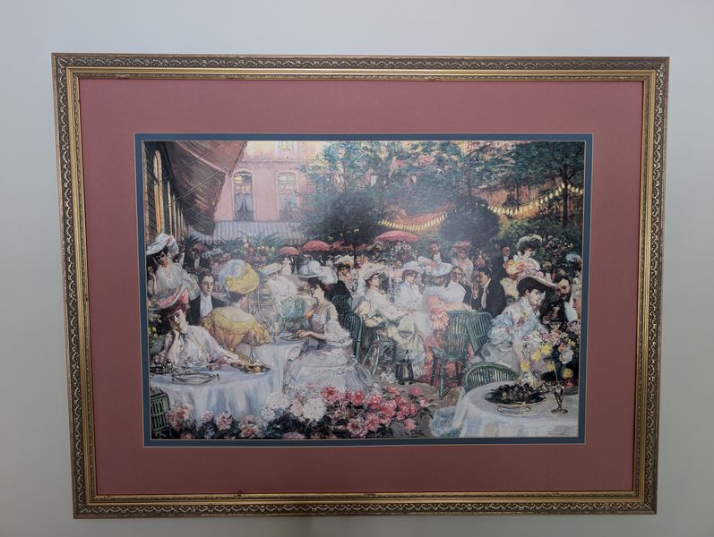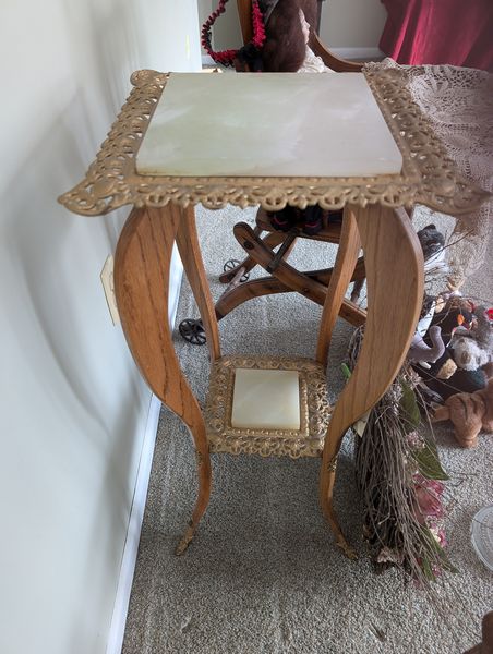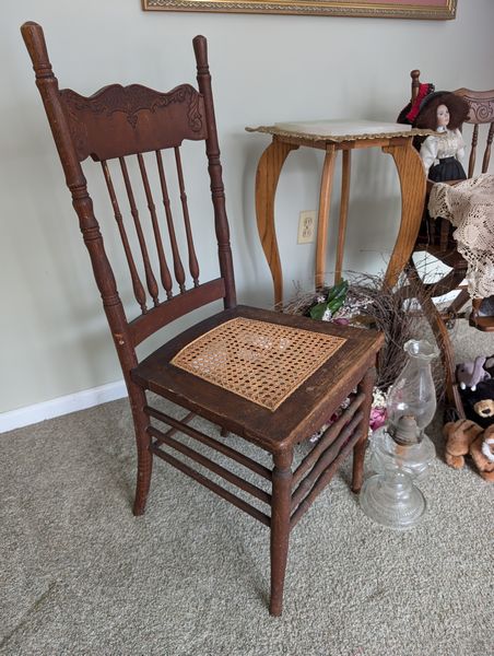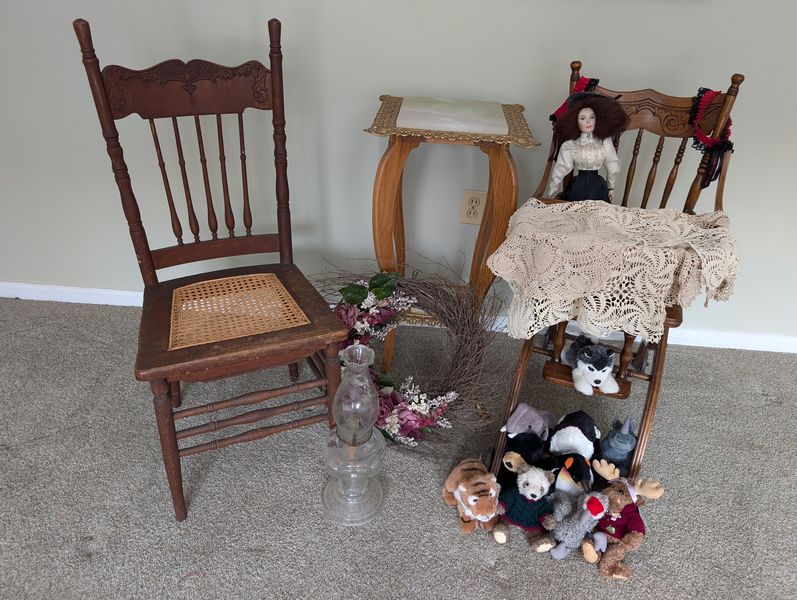 Antiques and Wall Art, featuring High Chair. Signed, framed wall art (no glass), 42"Wx33"H; porcelain handled pitcher, 1'H & bowl, 15"diam by Knowles; antique high chair, 17"Wx17"Dx37"H; side table, 14"sq x 32"H; antique porcelain doll; stuffed toys; kerosene lamp with glass hurricane globe; doilies; wreath decor.