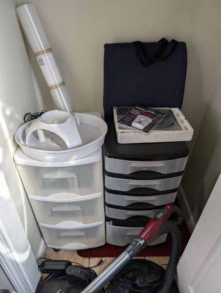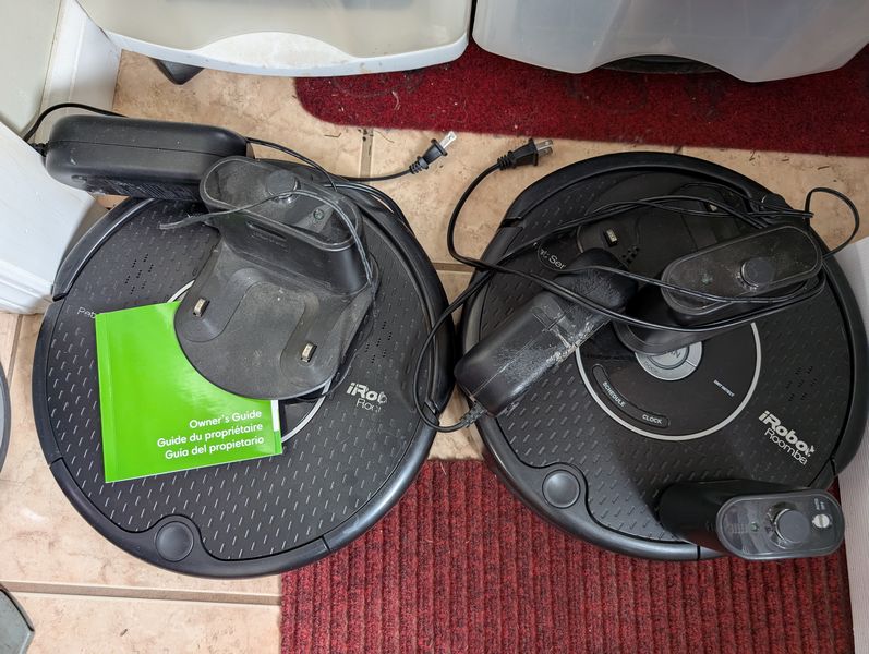 Household Functional, featuring i-Robot Roombas. Kenmore canister vac; two i-Robot Roomba floor cleaners; table top fan; plastic storage.