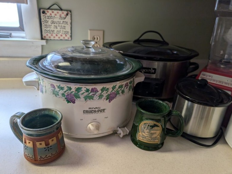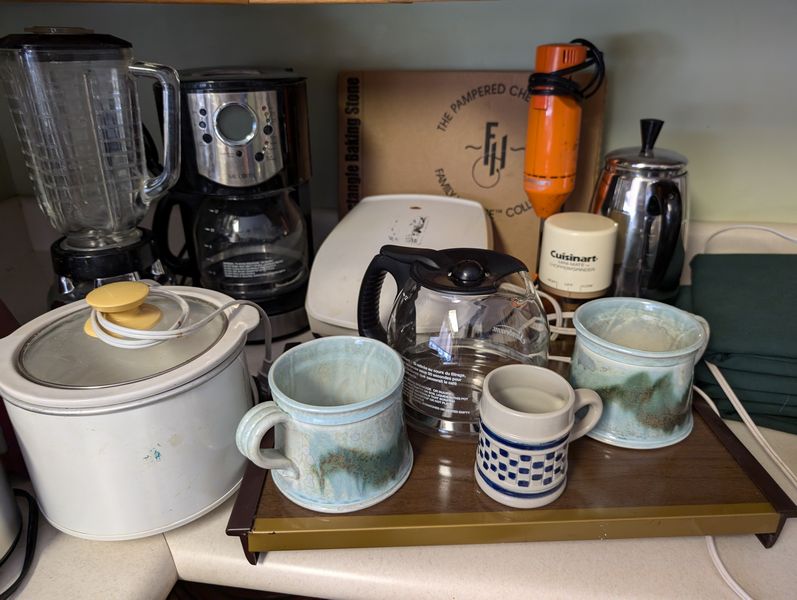 Countertop Appliances and Mugs. Incl: crock pot/slow cookers (diff sizes); blenders; coffee makers; sandwich maker; mugs. See photos for details.