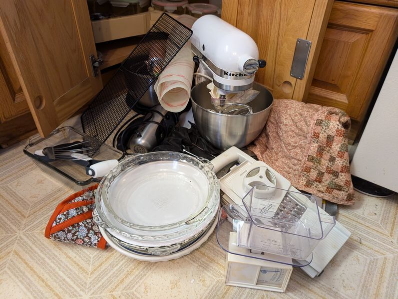 Bakeware, featuring Standing Mixer. KitchenAid white standing mixer with attach; (5) pie plates; (6) glass bowls (diff sizes); 7-pc snapwareglass storage with lids; Rival hand mixer; grater; hand tools; more! See photos.