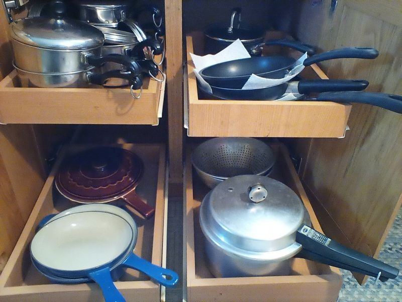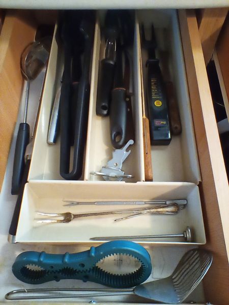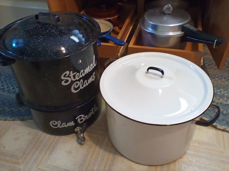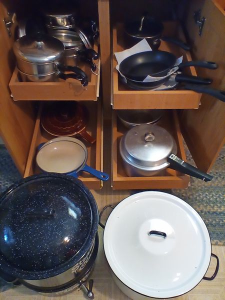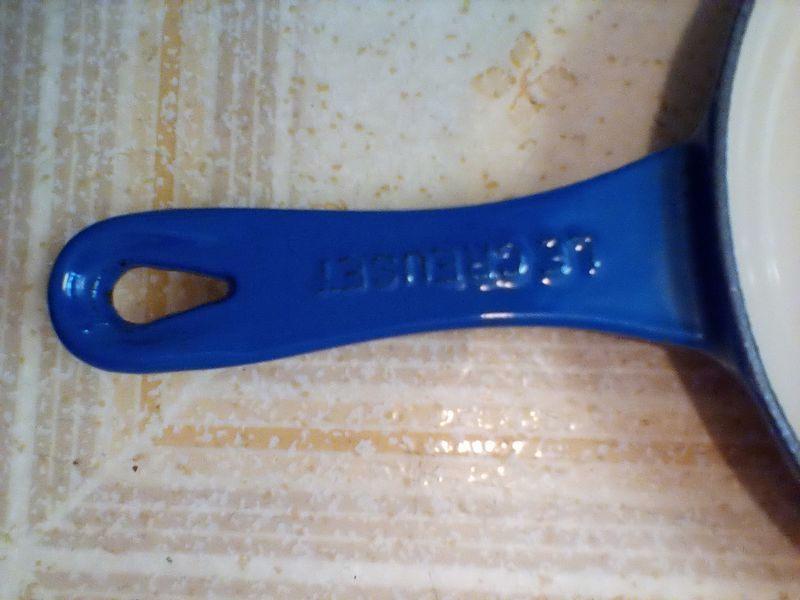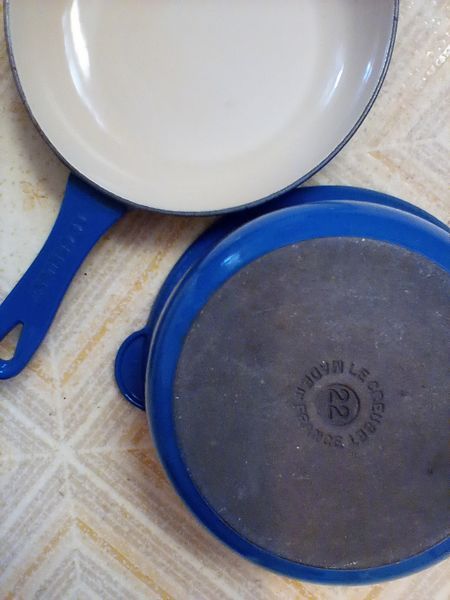 Pots and Pans, featuring Le Creuset. Large white stock pot, 13"diam x10"deep; set/2 Le Creuset fry pans (see photos); assort pots; pans; utensils; more! See photos.