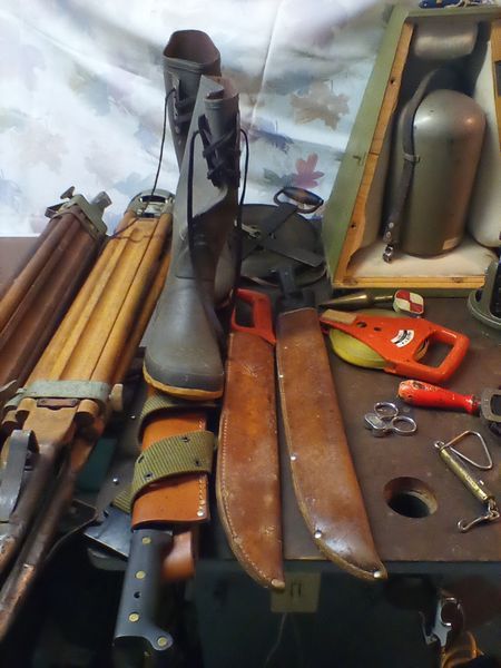 Survey Equipment. Incl field survey equipment; tripods; machete's in leather cases; boots; more! See photos for details. Loc in basement.