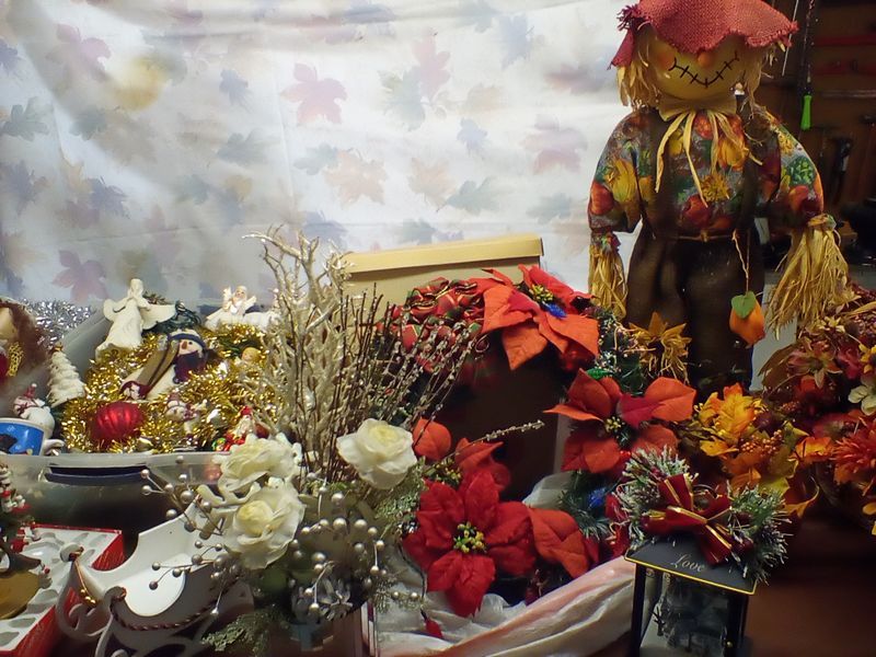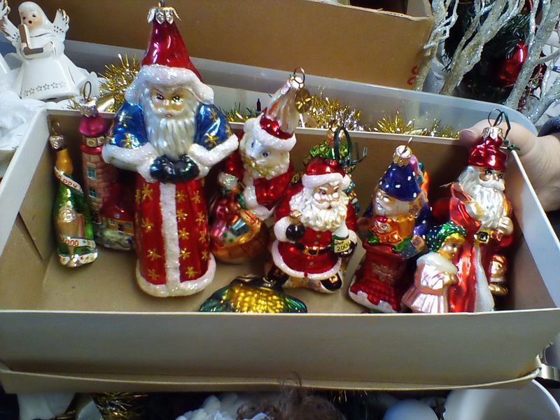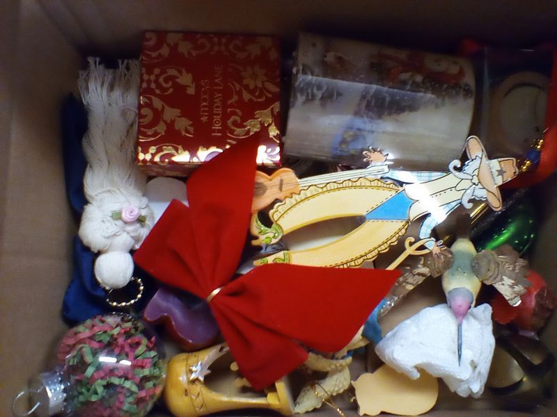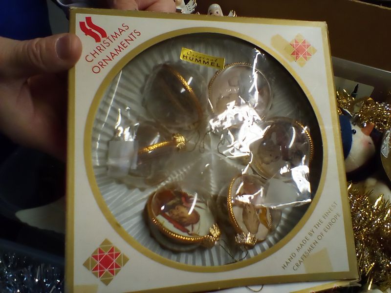 Seasonal Décor, featuring Hummel and Radko. Glass ornaments by Radko (see photo) and Hummel (boxed); artificial décor (winter & fall); other ornaments. See photos for qty and details. Loc in basement.
