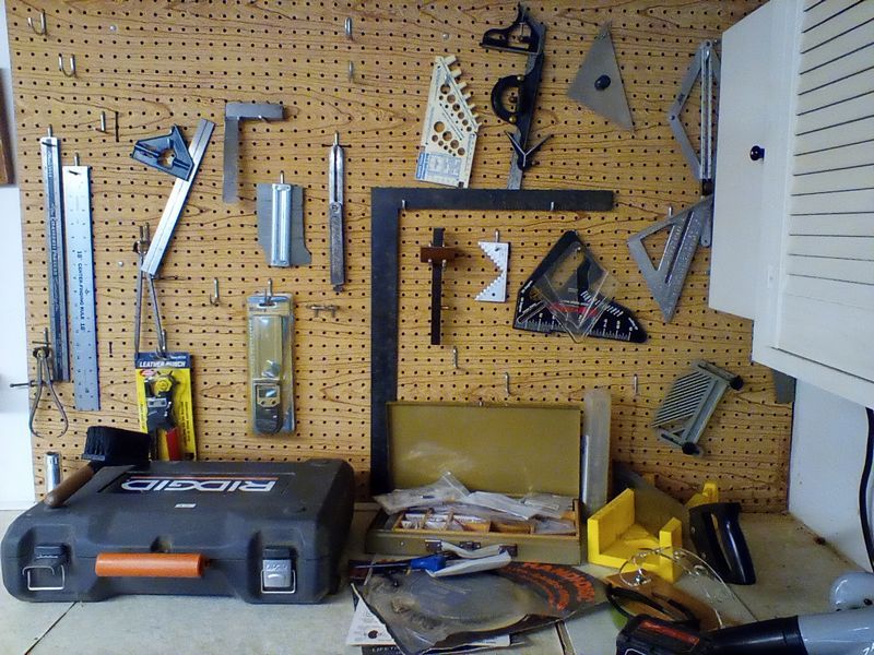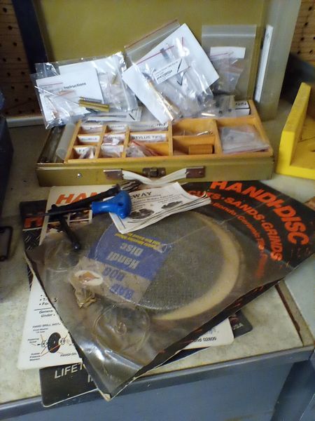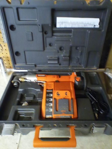 Rigid Drill, Milwaukee Chain Saw. Contents of counter and wall incl, Rigid right angle drill in case; Milwaukee mini chain saw; Mighty mini blower; measure; screwdrivers; wrenches, as seen on wall. Loc in basement near garage.