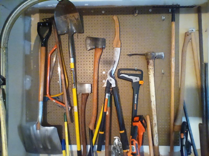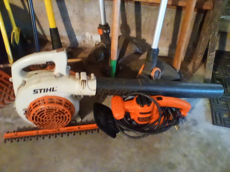 Lawn and Garden Tools, featuring Stihl. Tools incl: rakes; shovels; axes; Stihl gas leaf blower; Black & Decker Wedge elect hedge trimmer; B&D weedwhacker; other items as seen in photos. Loc in garage.